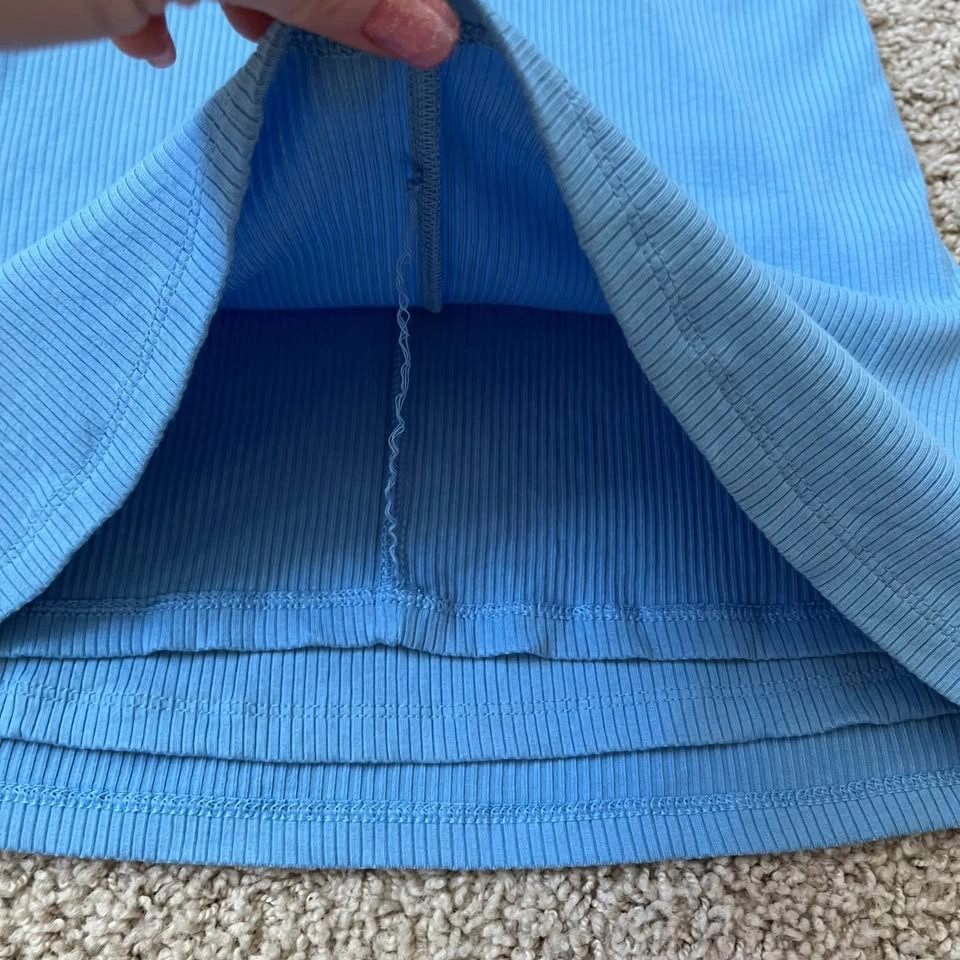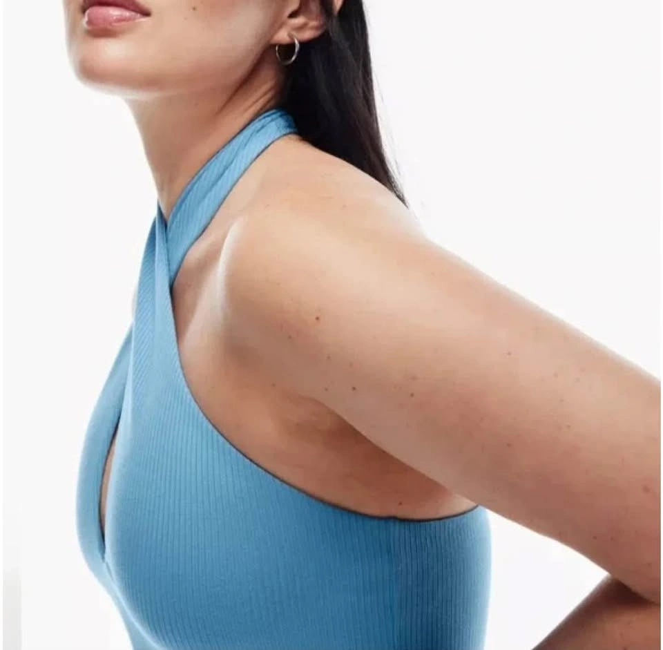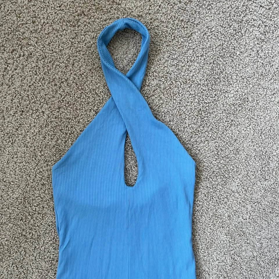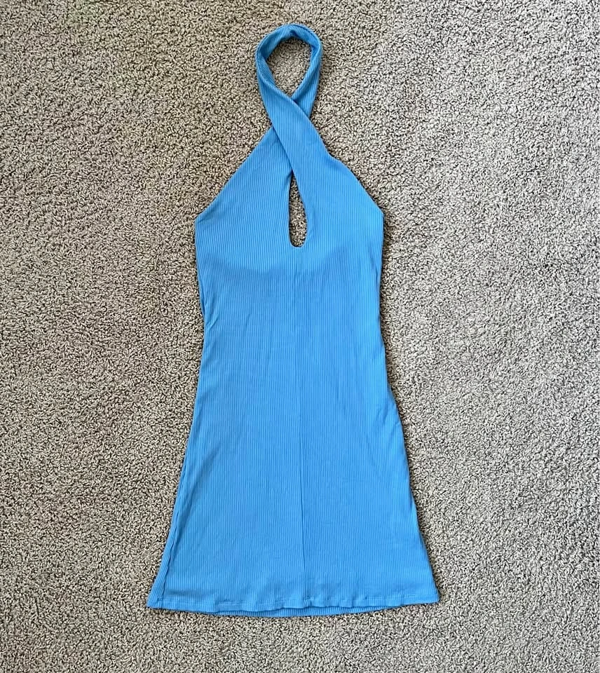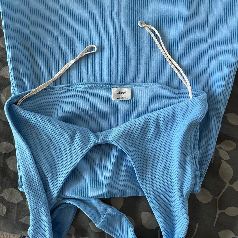 Aritzia Wilfred Bay twist front halter bodycon dress in sky blue. Double lined medium-weight ribbed material, very soft and flattering. Excellent pre-loved condition with a very small mark on the inside. The model pictures are included to illustrate fit only. Women's Size Small 91% Tencel Modal, 9% Elastane Article# 98181 Measurements are approx.: Full Length 90cm Pit to pit 30cm Waist 29cm Hips 36cm Pick up west Maple Ridge.