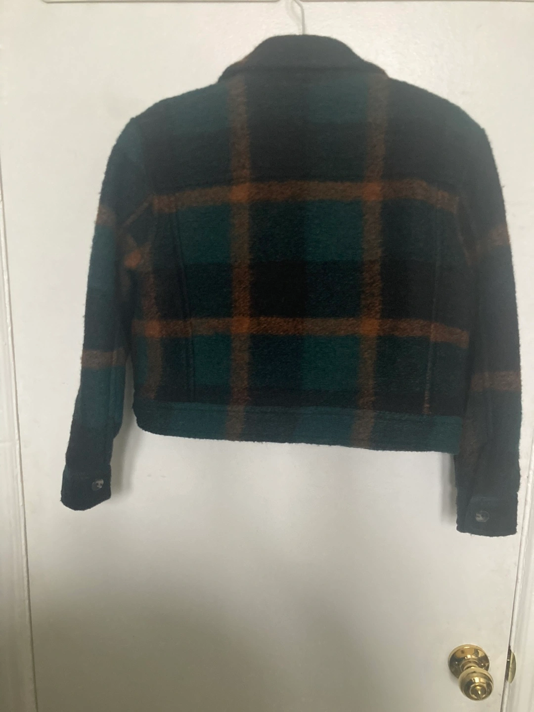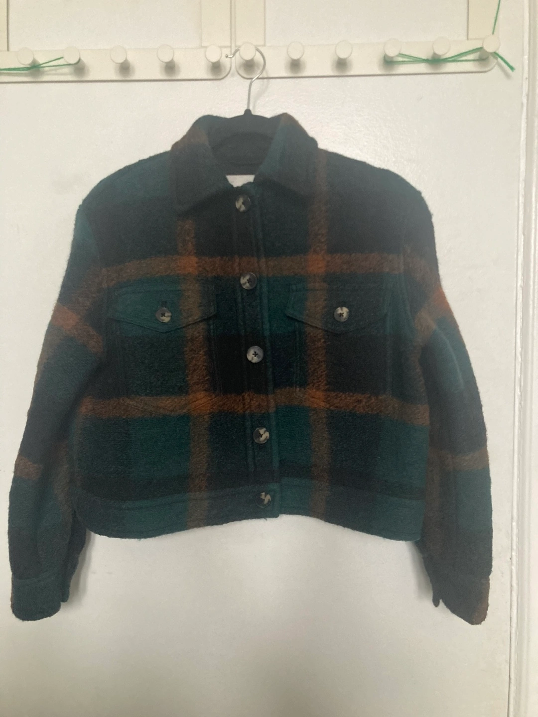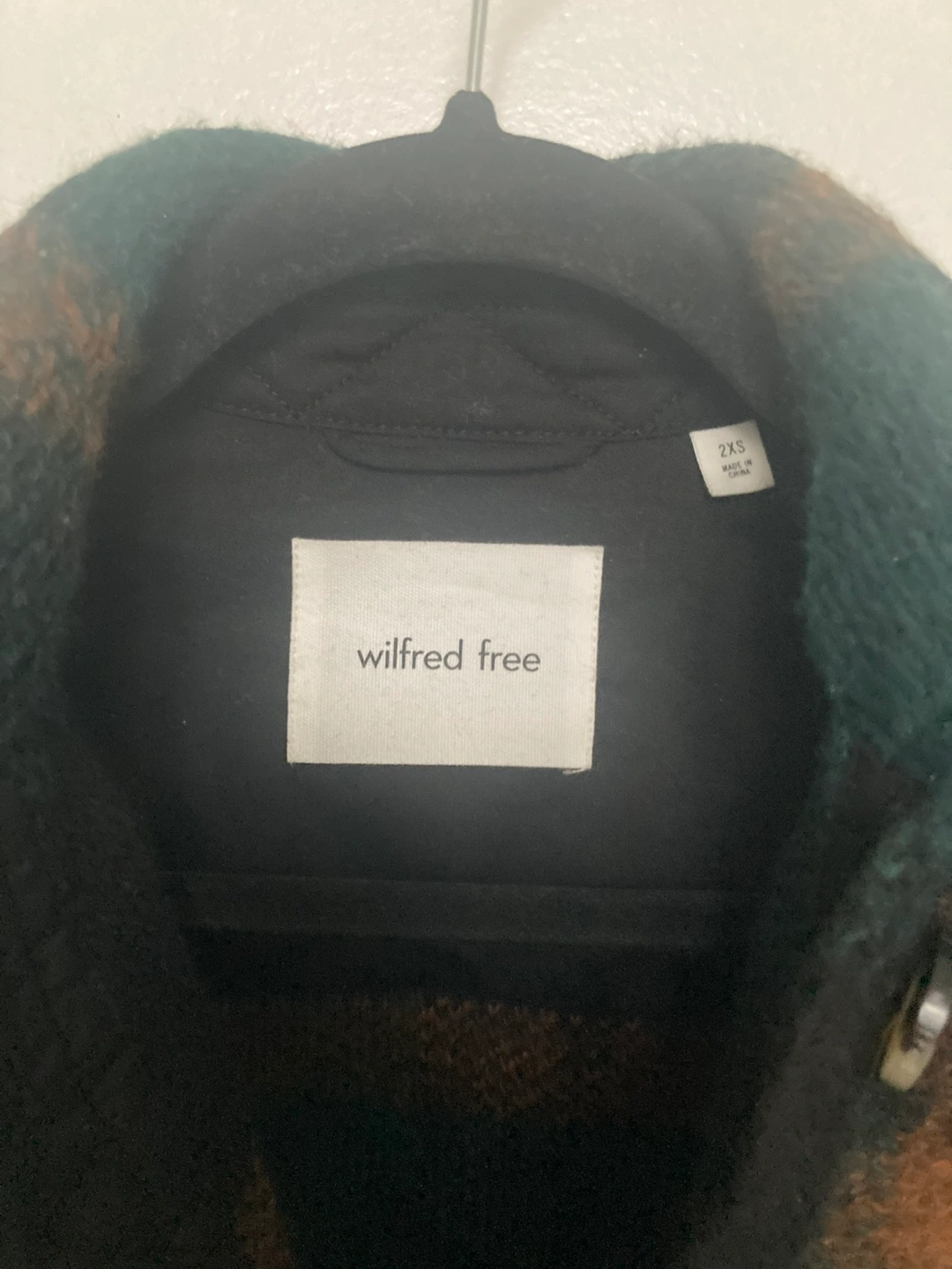 Selling a Wilfred Free plaid cropped jacket in size 2XS! It's in great condition and features a stylish plaid pattern in green, black, and brown tones. Perfect Fall wardrobe addition.