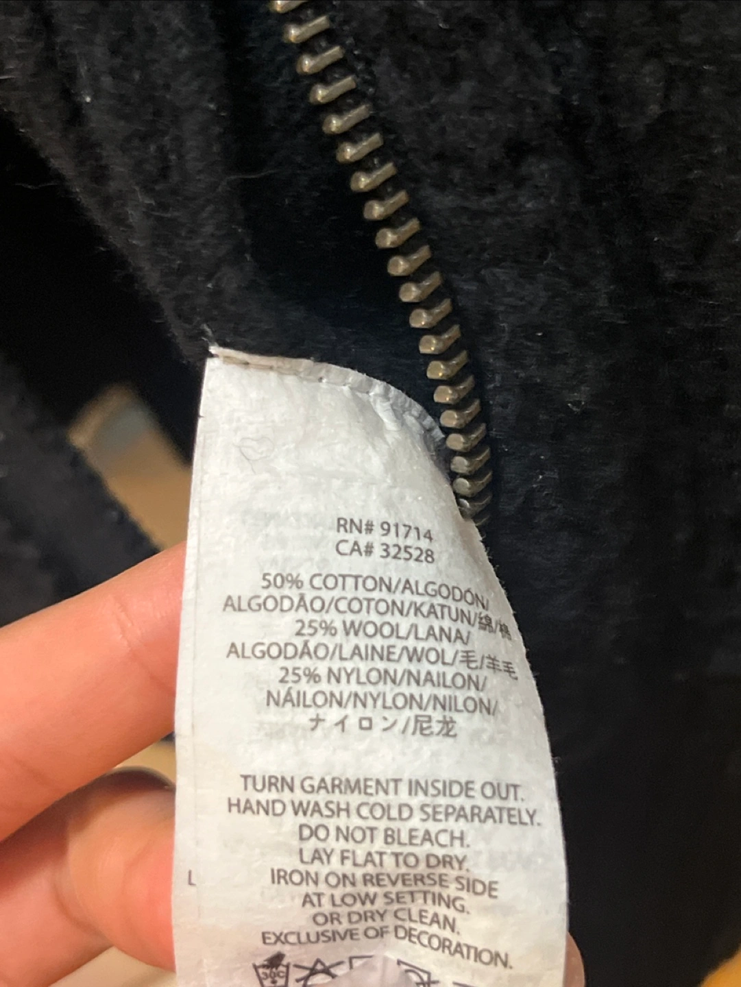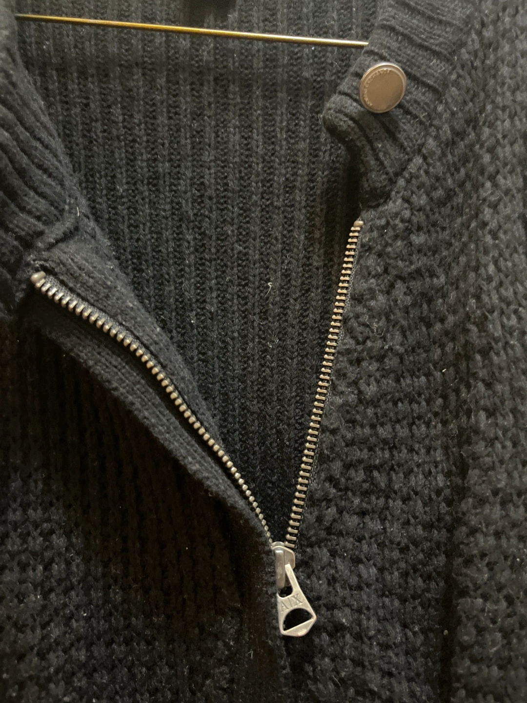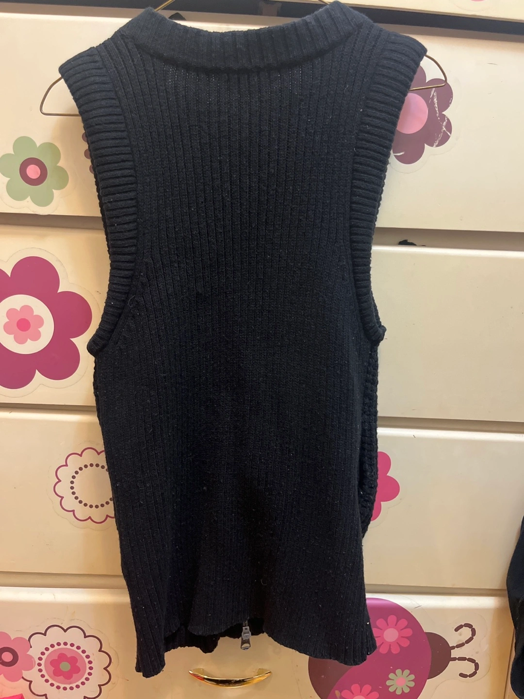 Black sleeveless knitted vest. Features a front zipper, ribbed detailing, and pockets on the inside. The material is 50% cotton, 25% wool, and 25% nylon.