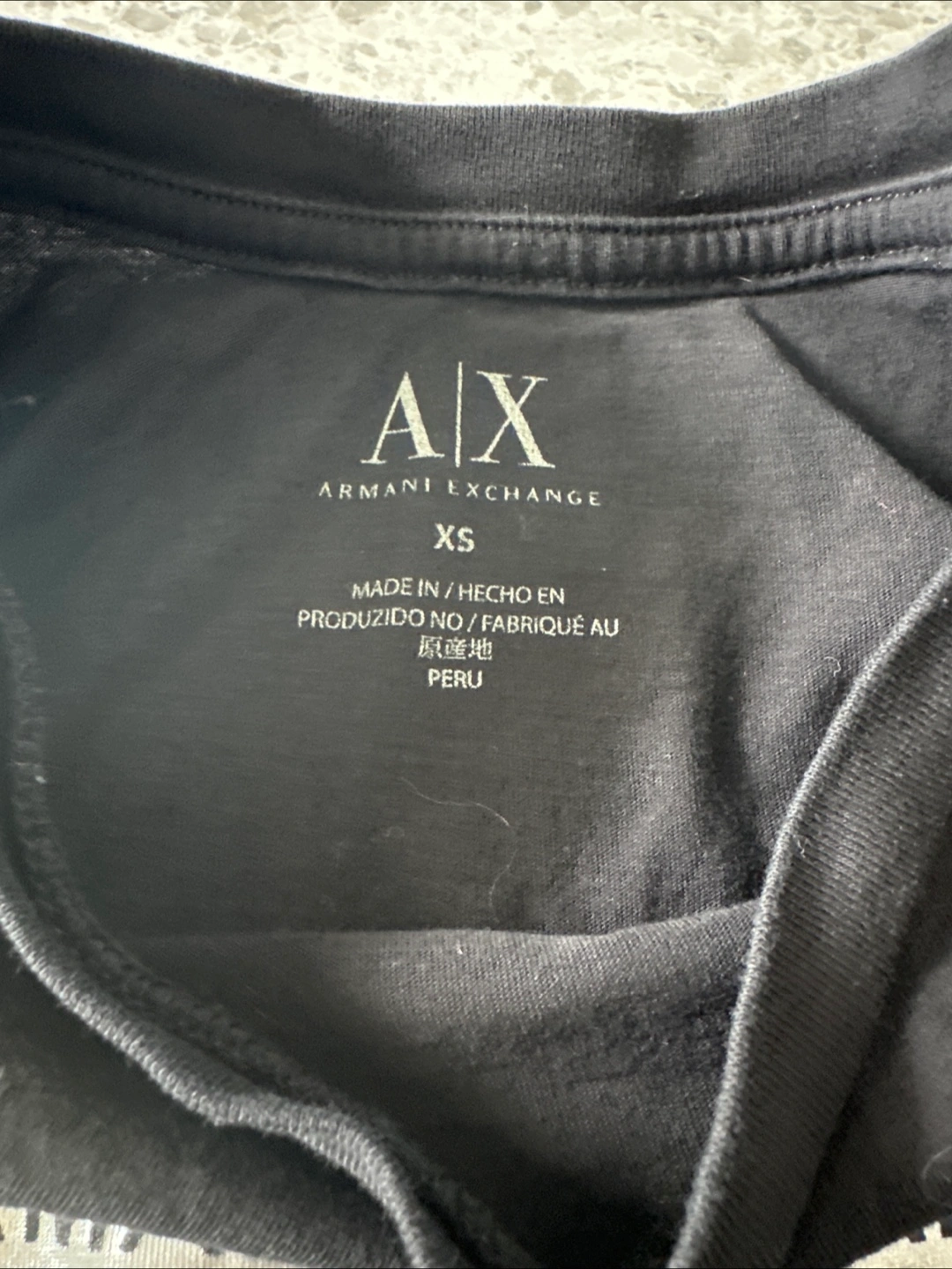 Selling a black Armani Exchange t-shirt in size XS. It's in good condition and ready for a new home! The material is soft and comfortable, perfect for everyday wear