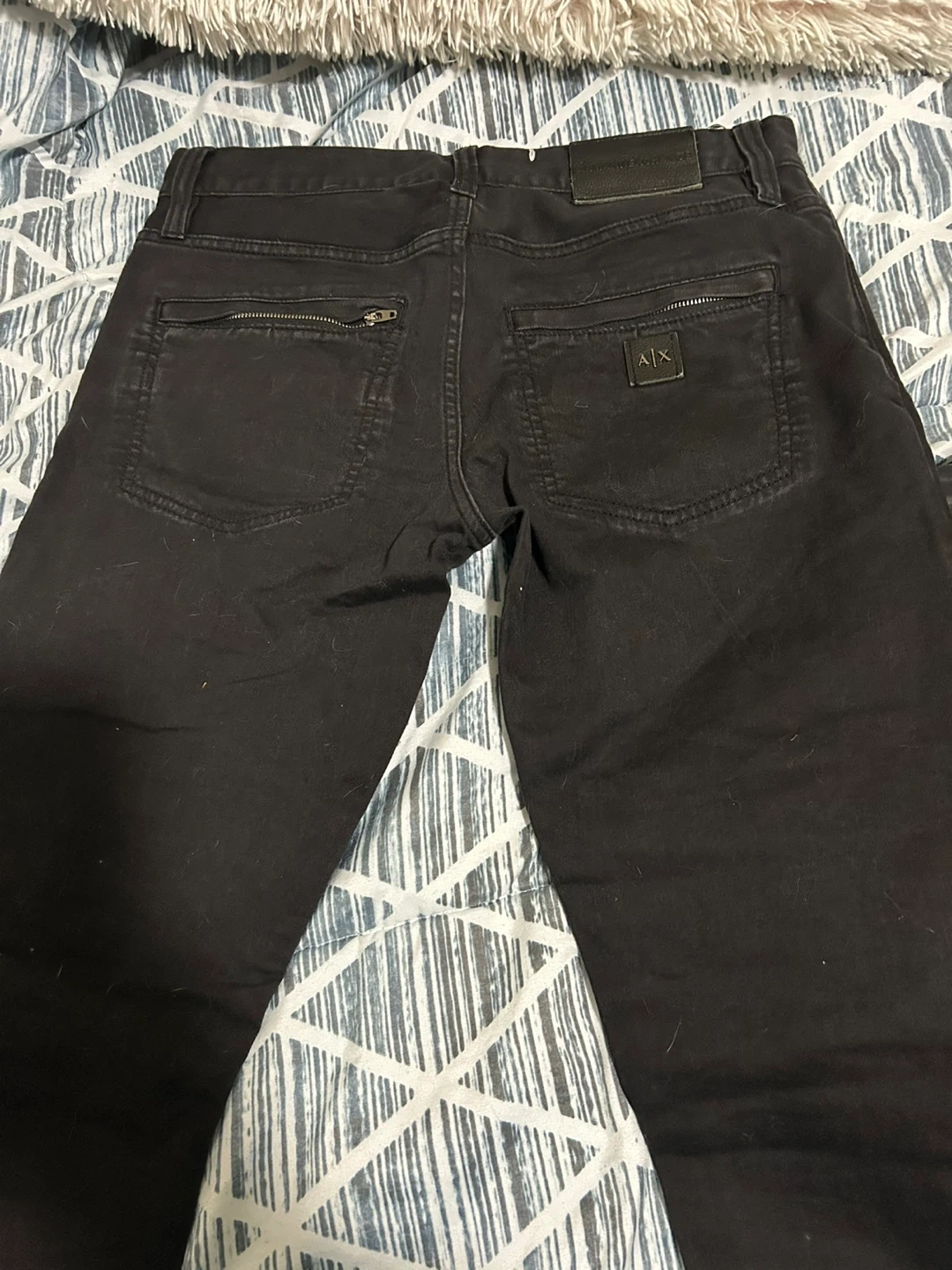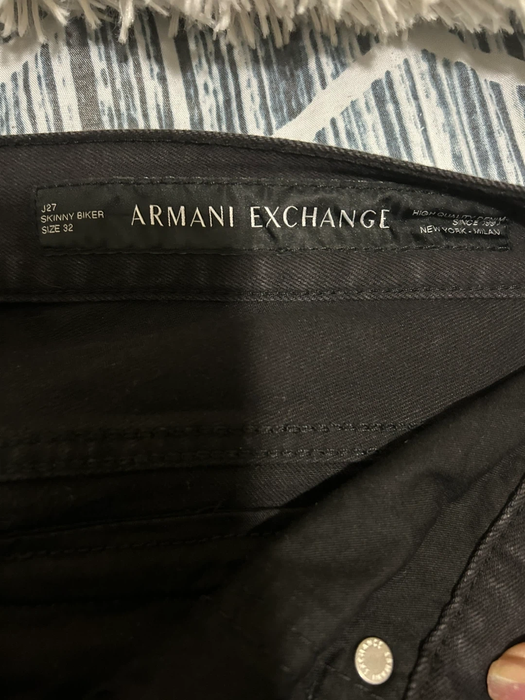 Selling a pair of Armani Exchange J27 Skinny Biker jeans in size 32. They are black and have a stylish biker design. These jeans are made from high-quality denim and have a slim fit