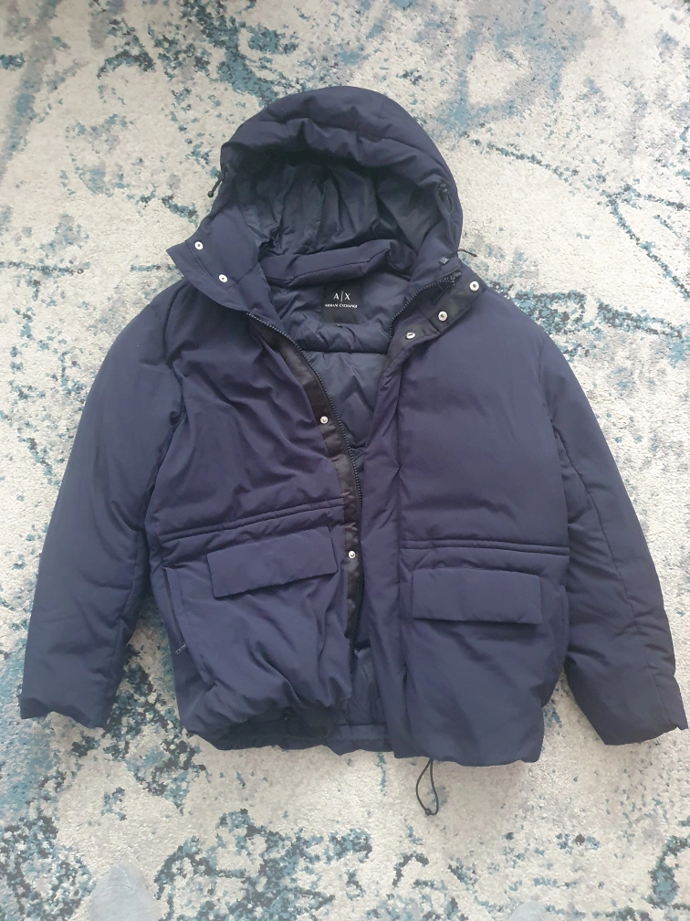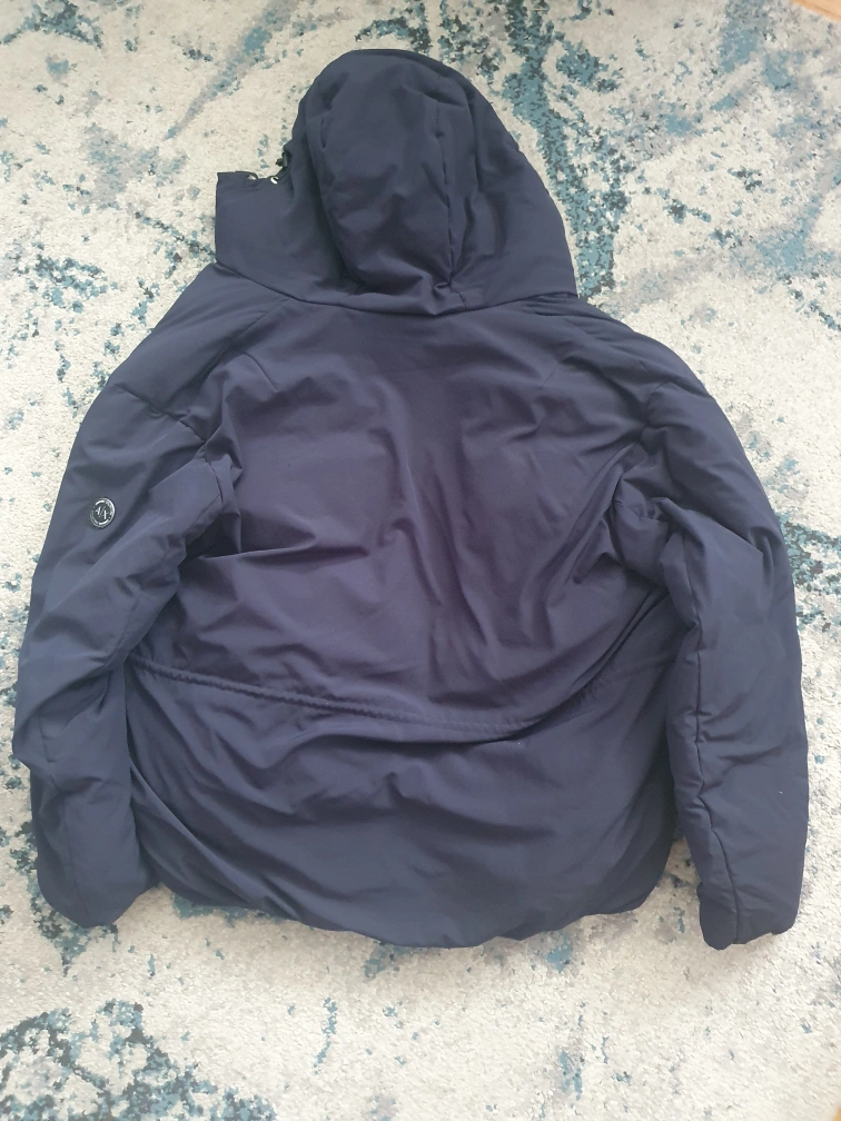 Size Large, navy blue puffer jacket with a hood.