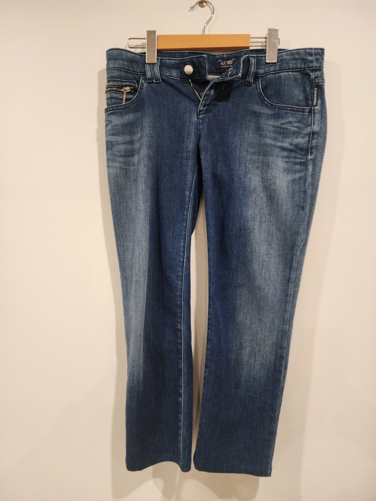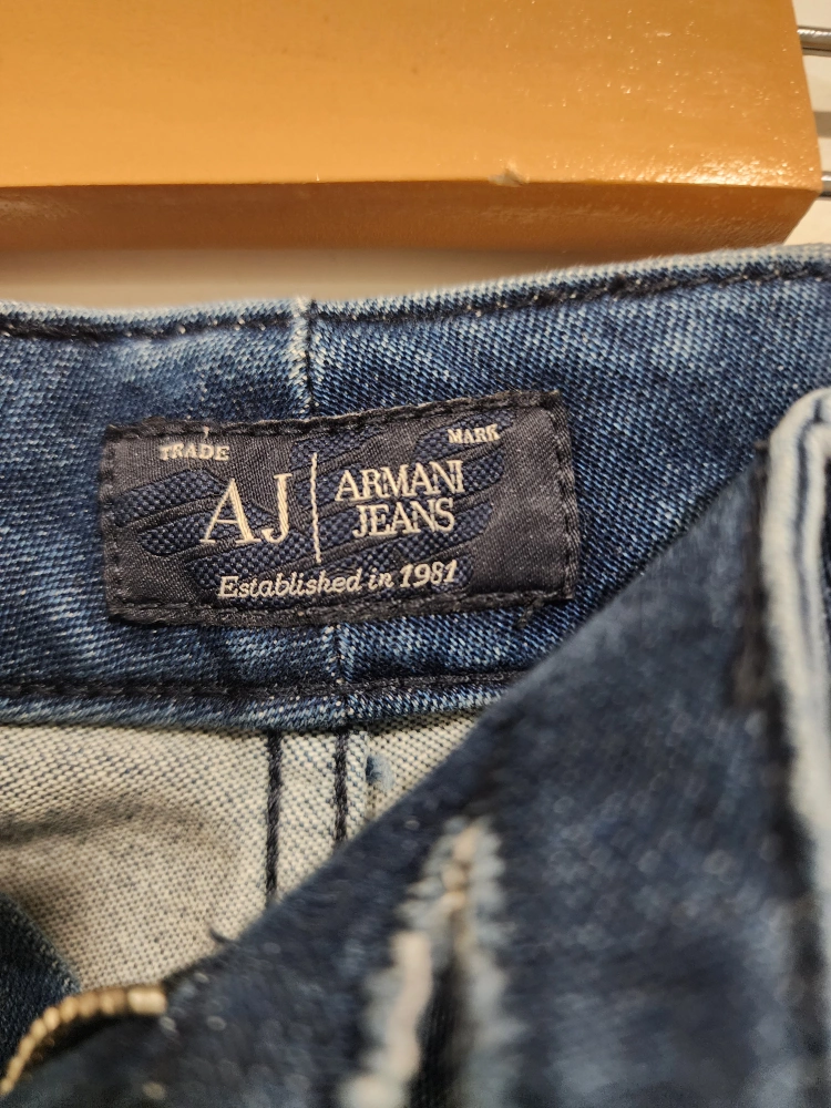 Selling a pair of Armani Jeans in denim. They are in great condition and ready for a new home. The jeans feature the classic Armani logo on the back pocket and a stylish design. They are comfortable and perfect for everyday wear!