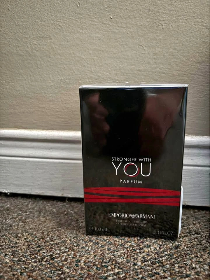 Armani Stronger With You Parfum 100ml. It has a rich, warm, and sensual scent profile that is a deeper and more intense version of the original. It opens with a spicy and citrusy burst of mandarin and pink pepper. The heart of the fragrance features aromatic notes of lavender and sage, while the base is defined by a distinctively warm and alluring blend of leathery vanilla and the signature sweet chestnut accord. The overall impression is a powerful, ambery, and woody fragrance with a sweet, nutty, and slightly spicy character. Open to fair offers.