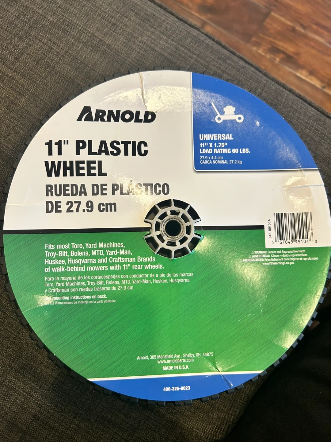 Selling an Arnold 11" plastic wheel! It's universal and fits most Toro, Yard Machines, Troy-Bilt, Bolens, MTD, Yard-Man, Huskee, Husqvarna and Craftsman Brands of walk-behind mowers with 11" rear wheels. Load rating 60 lbs