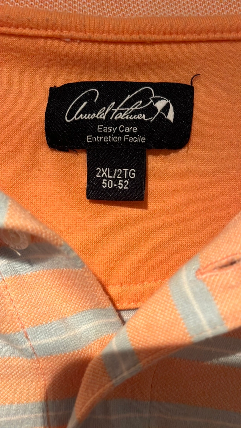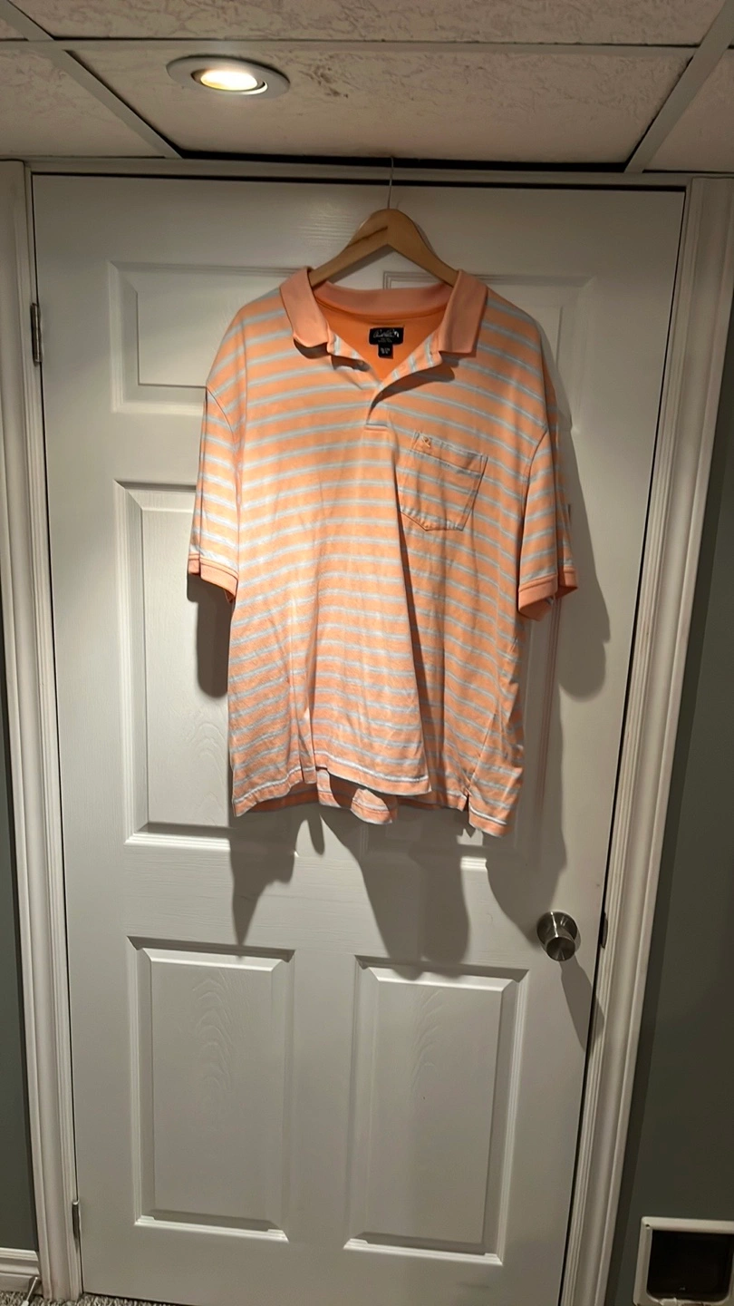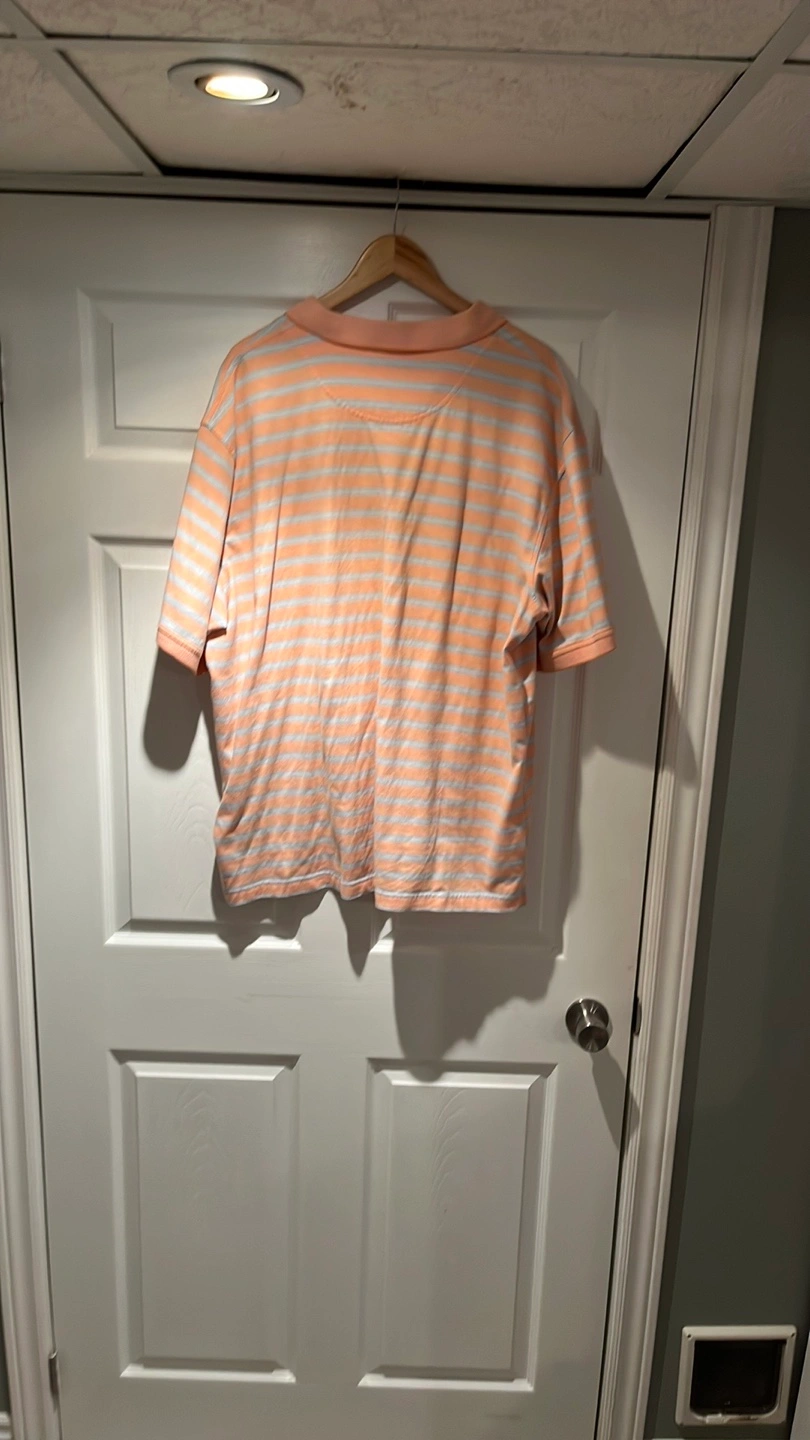 Peach and white striped polo shirt. Size 2XL. Short sleeves. One chest pocket. Easy care.