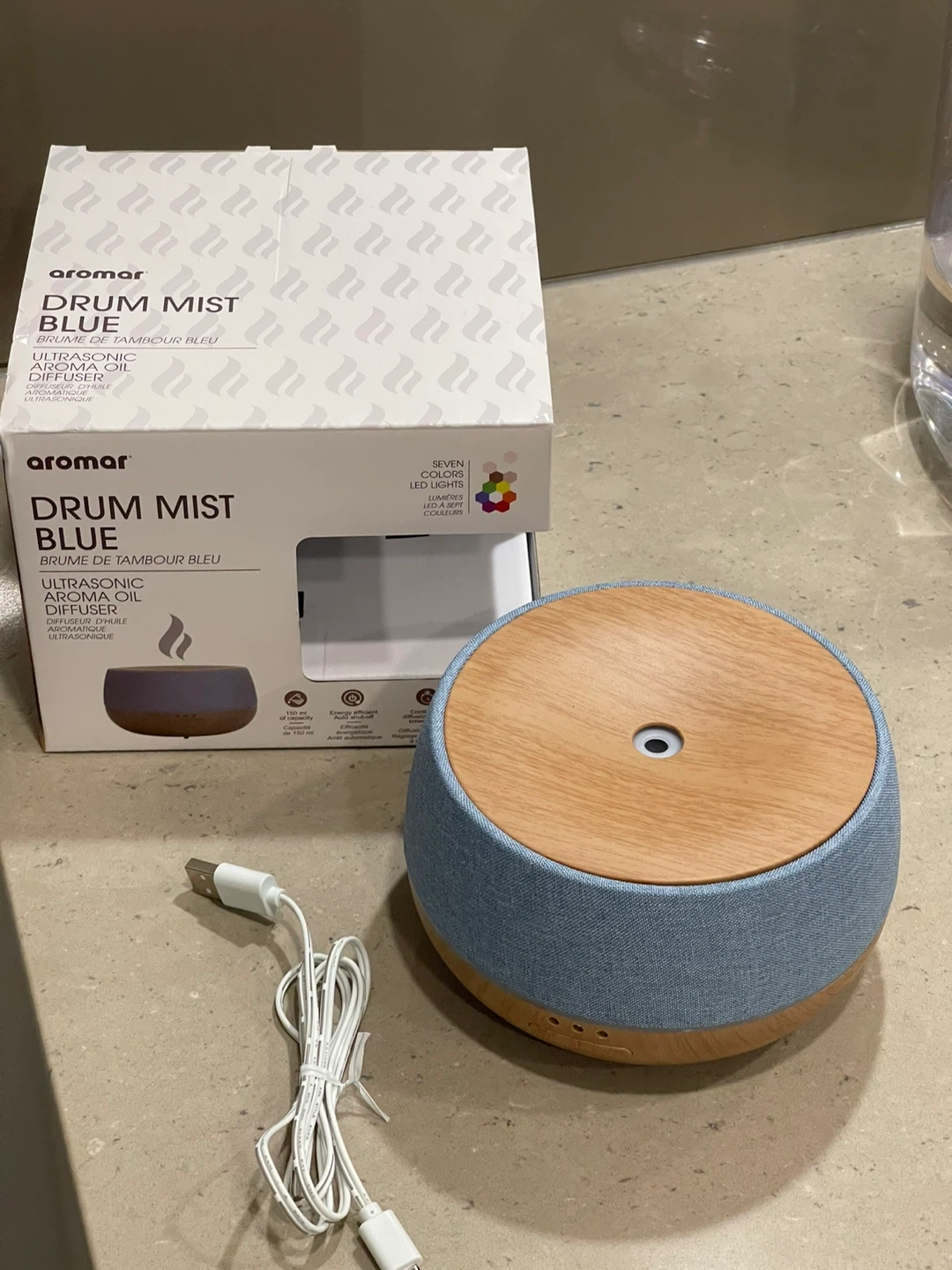 This is an Aromar Drum Mist Blue ultrasonic aroma oil diffuser. It comes with the diffuser, adapter/USB cable, and instructions. The diffuser has seven colour changing LED lights. It's in great condition and ready to use to create a calming atmosphere with cool mist and colour lights