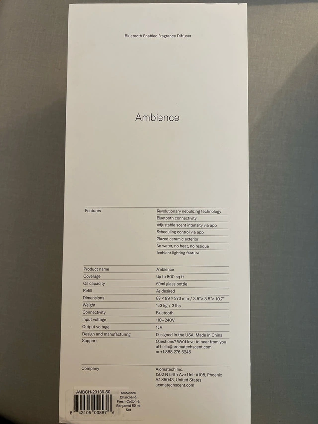 Enhance your home's atmosphere with the Aromatech Ambiance fragrance diffuser, featuring Bluetooth connectivity and adjustable scent intensity, controlled via a user-friendly app. This diffuser is in new condition, ready to fill your space with delightful aromas. Here are some of its features: * Hands-free, memory resulting technology * Bluetooth Connectivity * Adjustable scent intensity via app * Scheduling control via app * Ambient scent lighting feature Transform your living space into a fragrant oasis! If the ad is up, it's available!