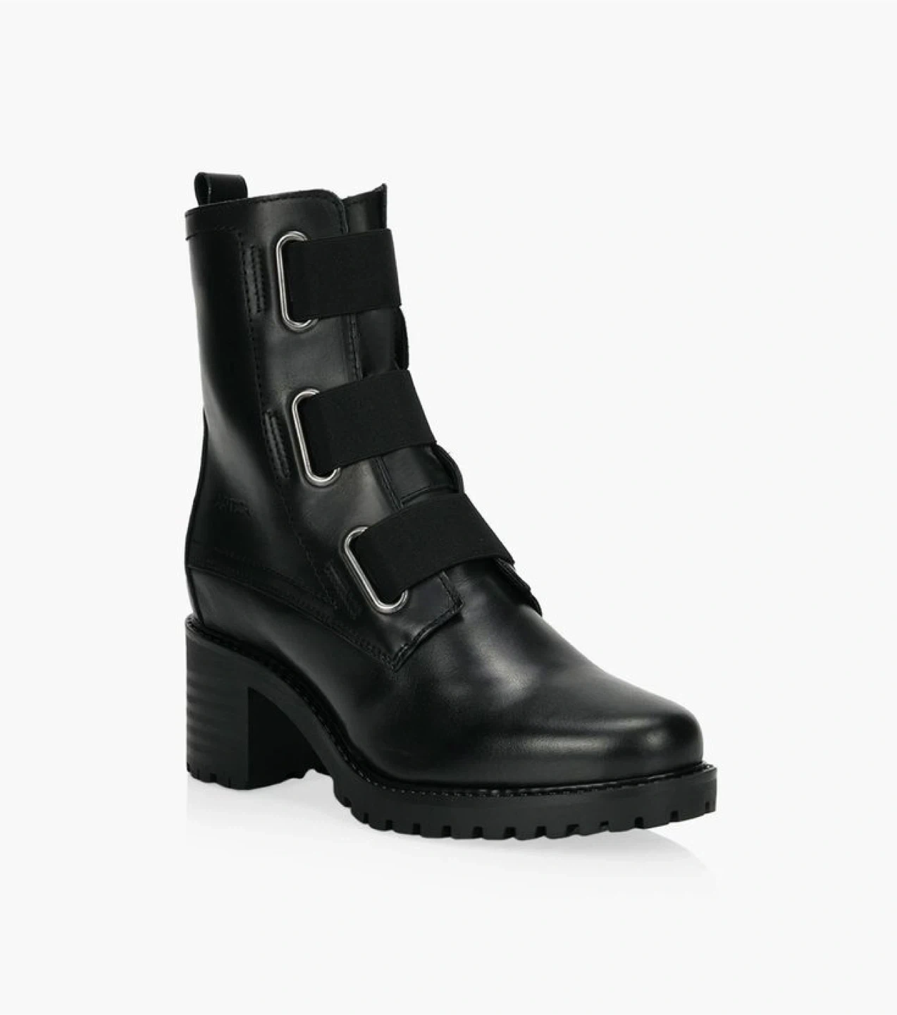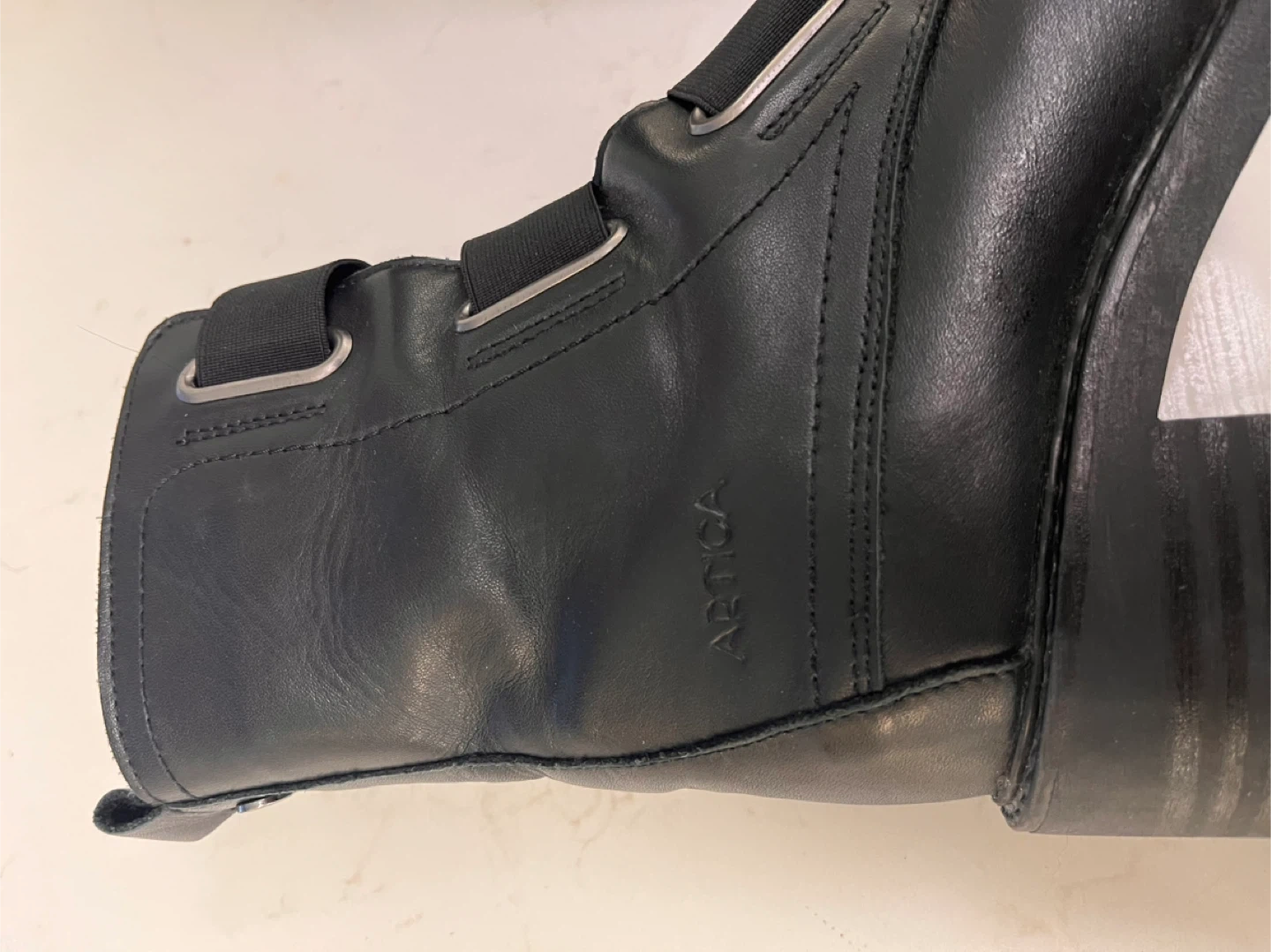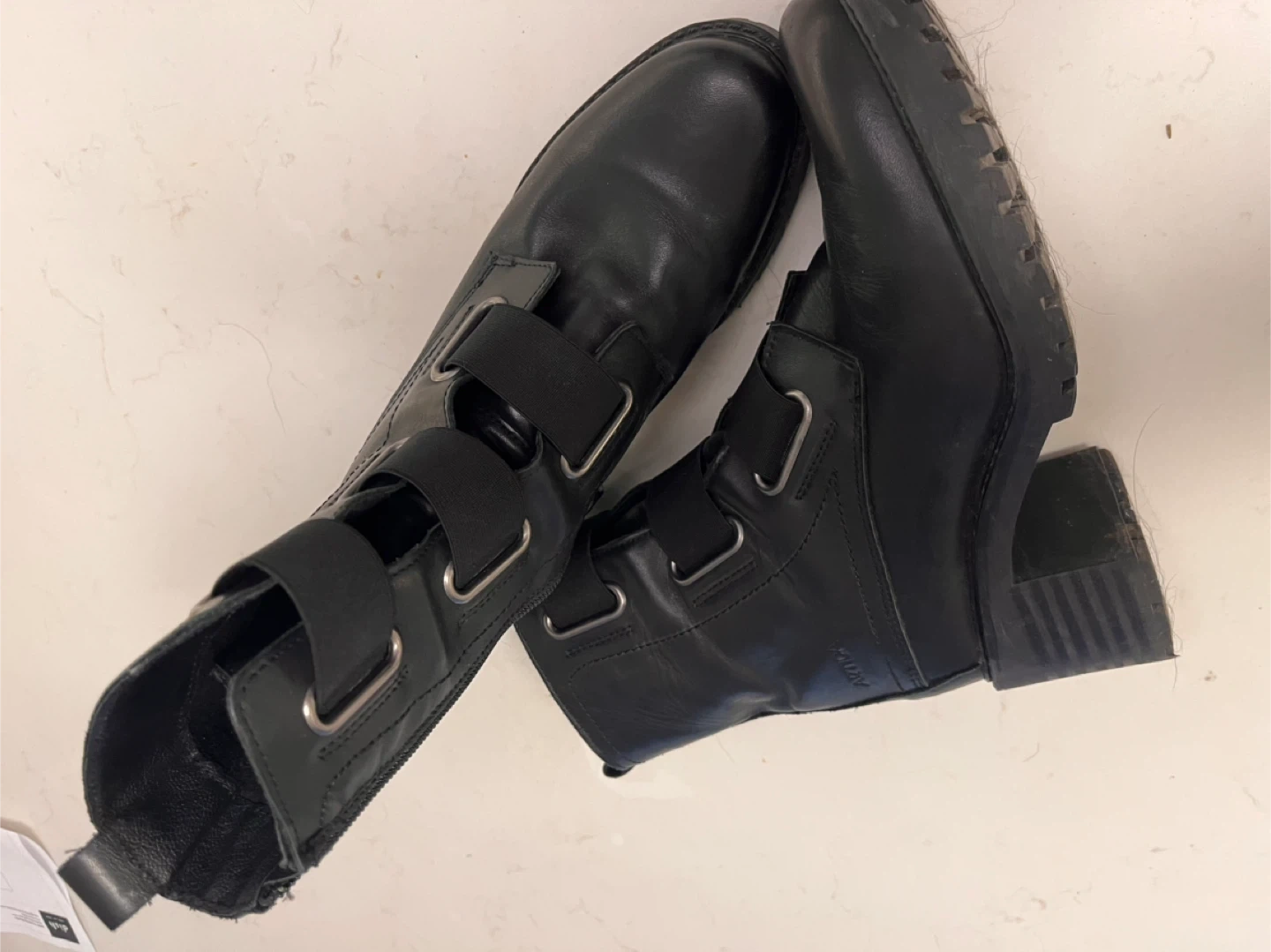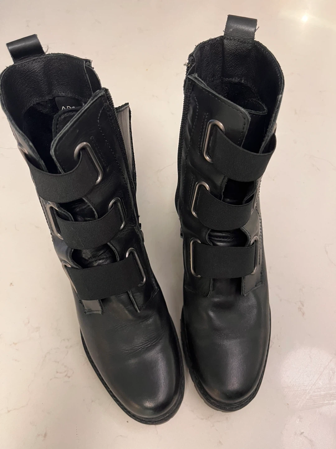 These Artica boots are made of black leather and feature a block heel. They have a strap and buckle design. Perfect for adding a bit of edge to your outfit!