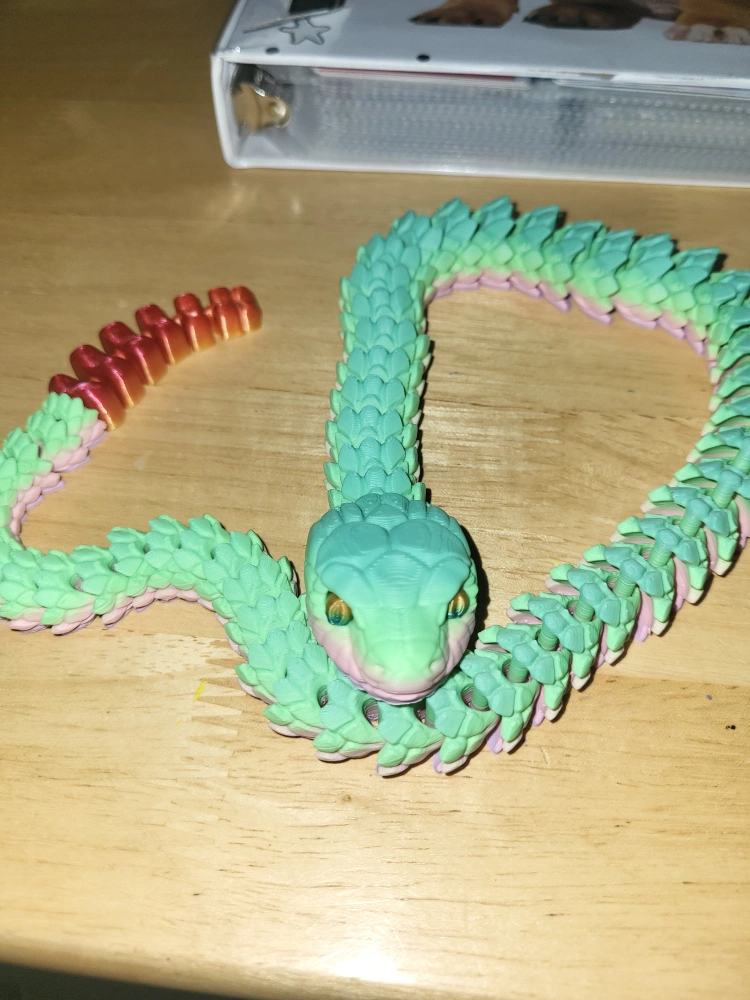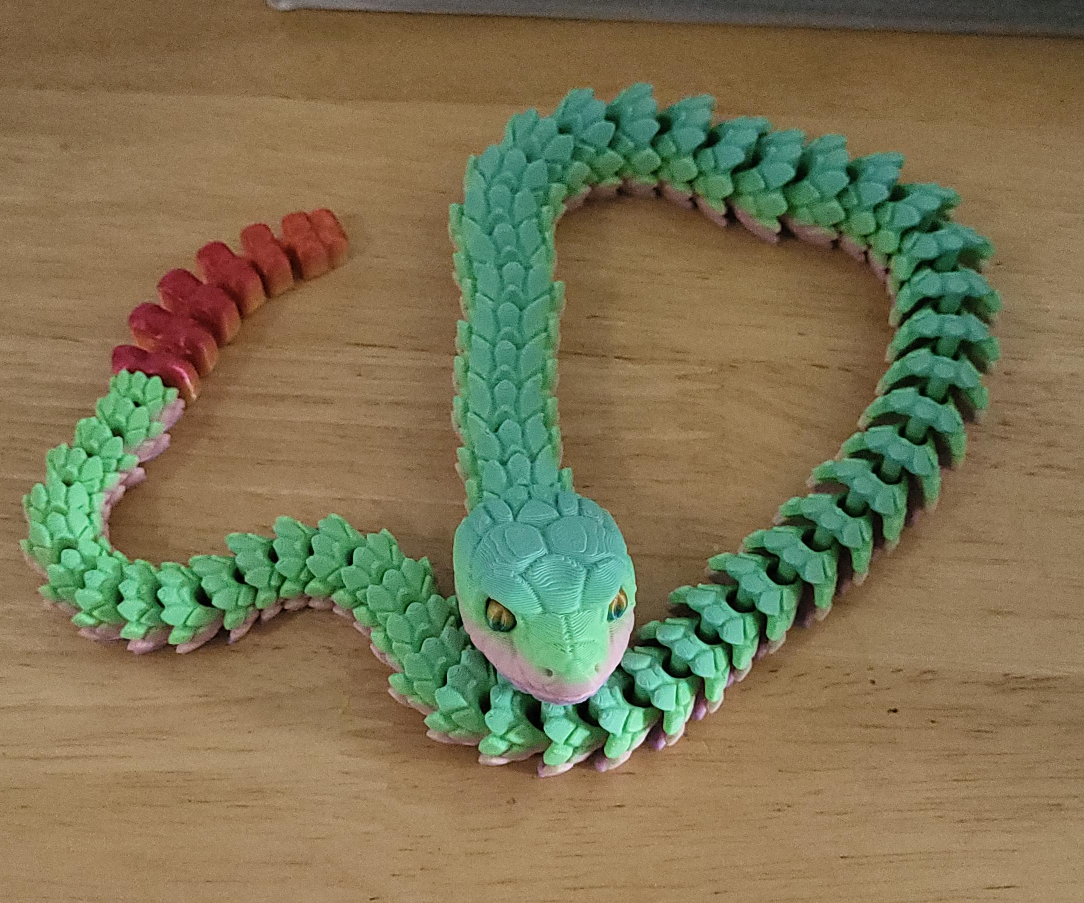 Show allSelling a fun, articulated 3D printed snake! It's green with red and pink accents. It's in great condition and would make a cool fidget toy or decoration