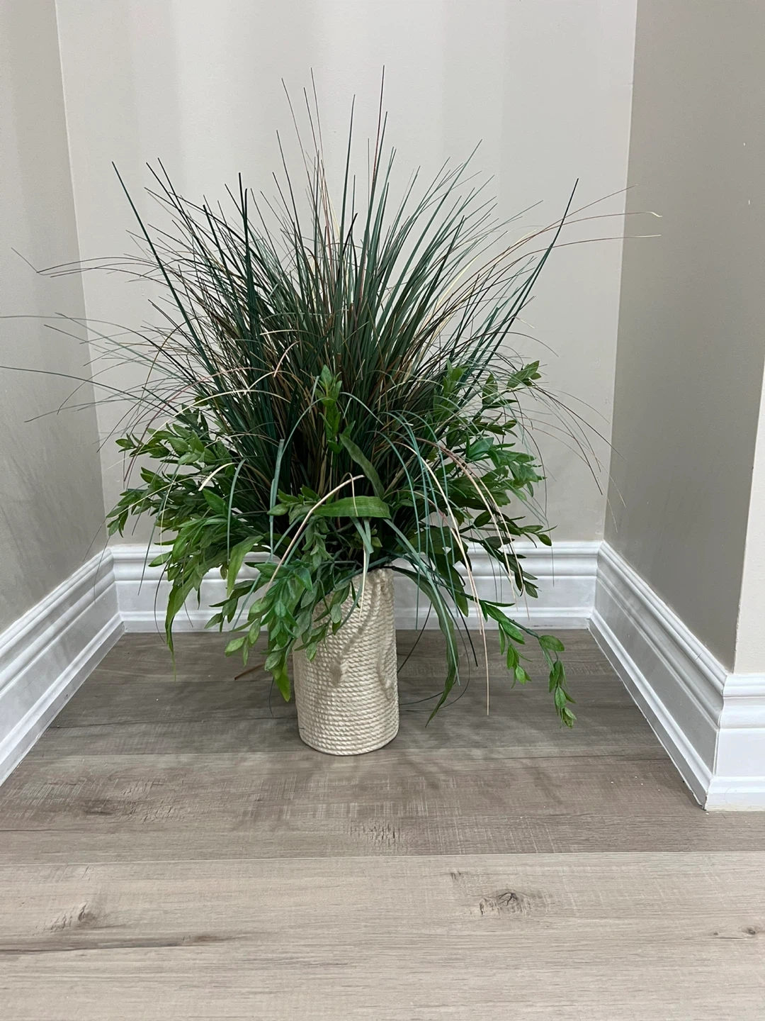 Artificial grass plant in a decorative vase. Perfect for adding a touch of greenery to your home without the maintenance of real plants. It's in great condition and ready to brighten up any space Height from the floor 66 cm
