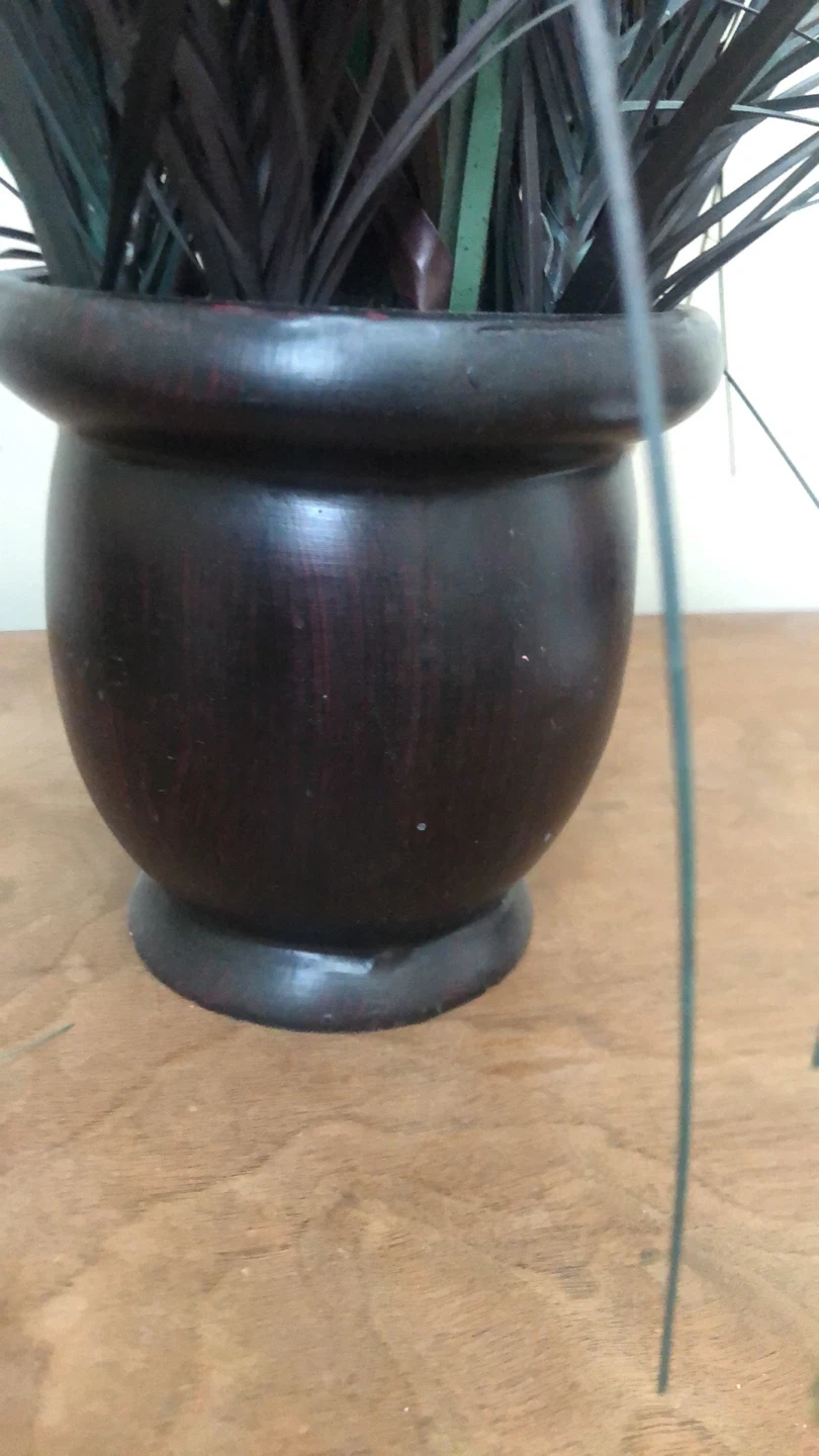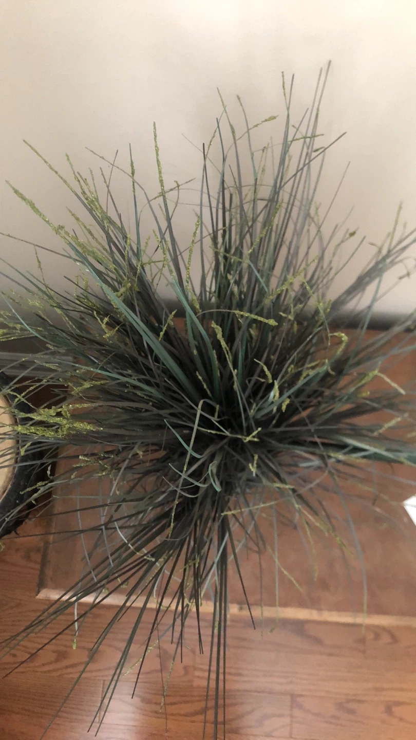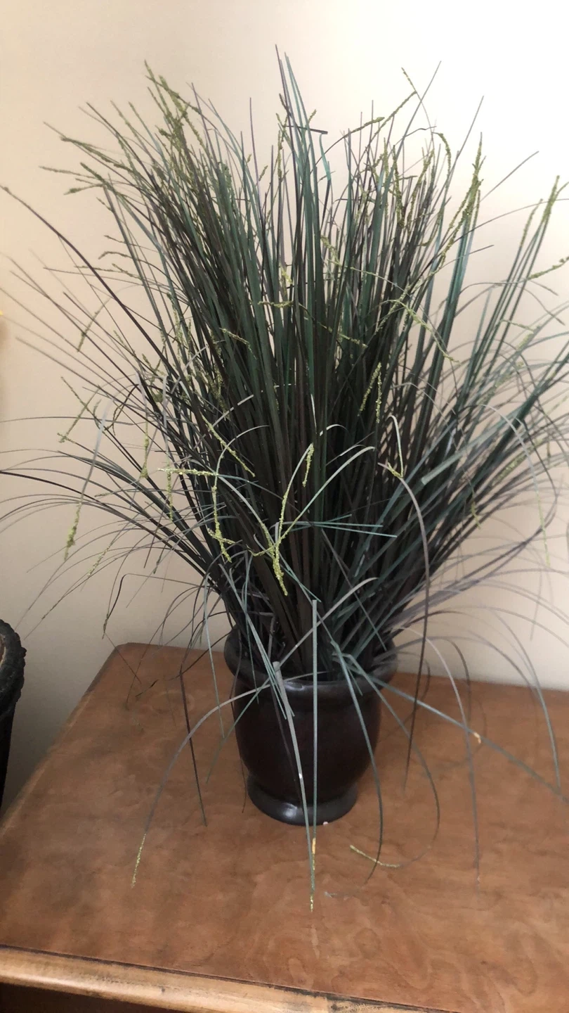 Selling an artificial decorative grass in a dark brown pot. It's in great condition and adds a nice touch to any room. The plant features long, dark green and black blades, making it a unique piece for your home