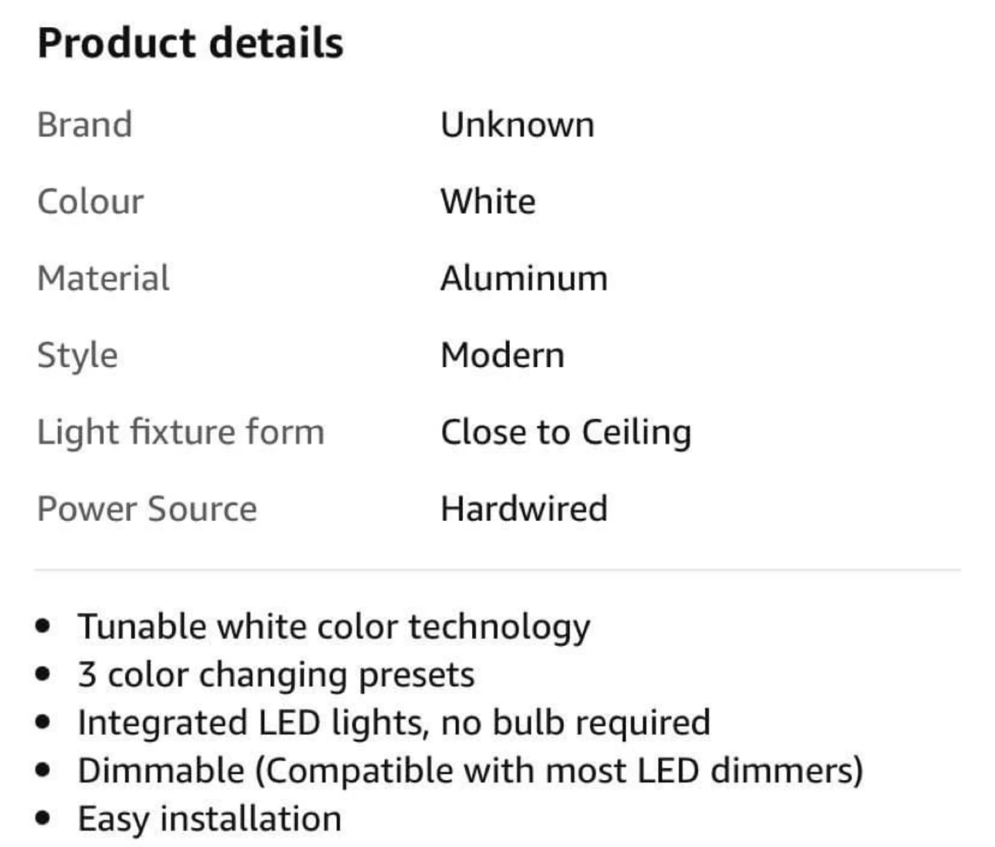 •Bought in 2022. •Tunable white color technology •3 color changing presets •Integrated LED lights, no bulb required •Dimmable (Compatible with most LED dimmers) •Easy installation (The clip of the lamp is a bit faulty)
