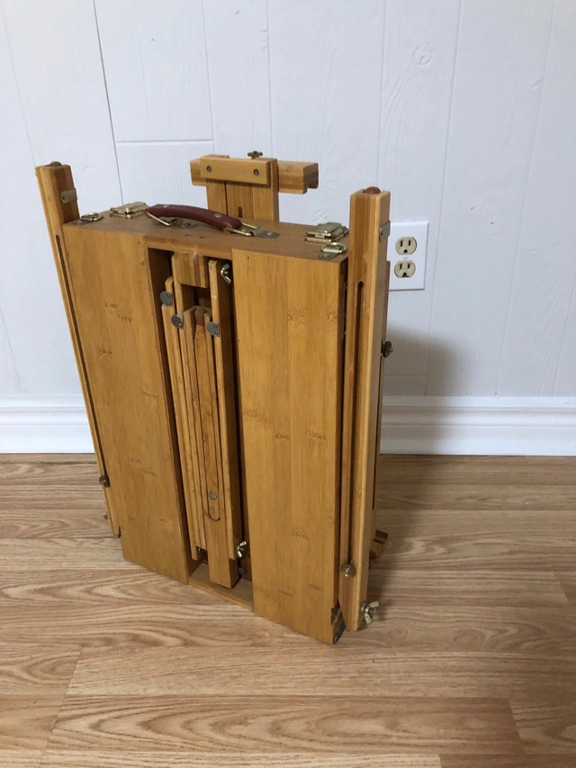 Elevate your artistry with this used, portable wooden artist easel, perfect for painters on the go! Its compact design unfolds to provide a sturdy workstation wherever inspiration strikes. This easel has signs of use, which adds to its character while remaining fully functional. Embrace the blend of practicality and charm it brings to your creative process. Specifications: * Material: Wood * Type: Portable Field Easel * Condition: Used * Features: Folding design, integrated handle Unleash your inner Picasso with this fantastic find. If you're seeing this ad, yes, it's still available!