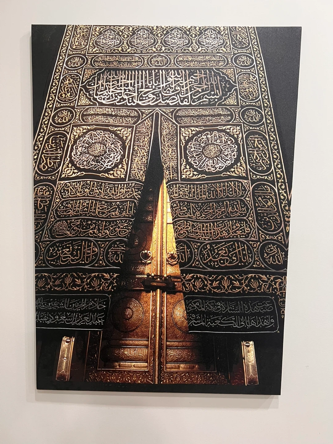 This is a beautiful piece of artwork depicting the door of the Kaaba. The intricate details and design are truly captivating. It would make a stunning addition to any home or office!