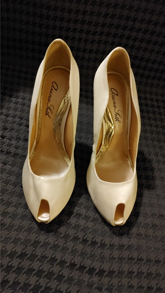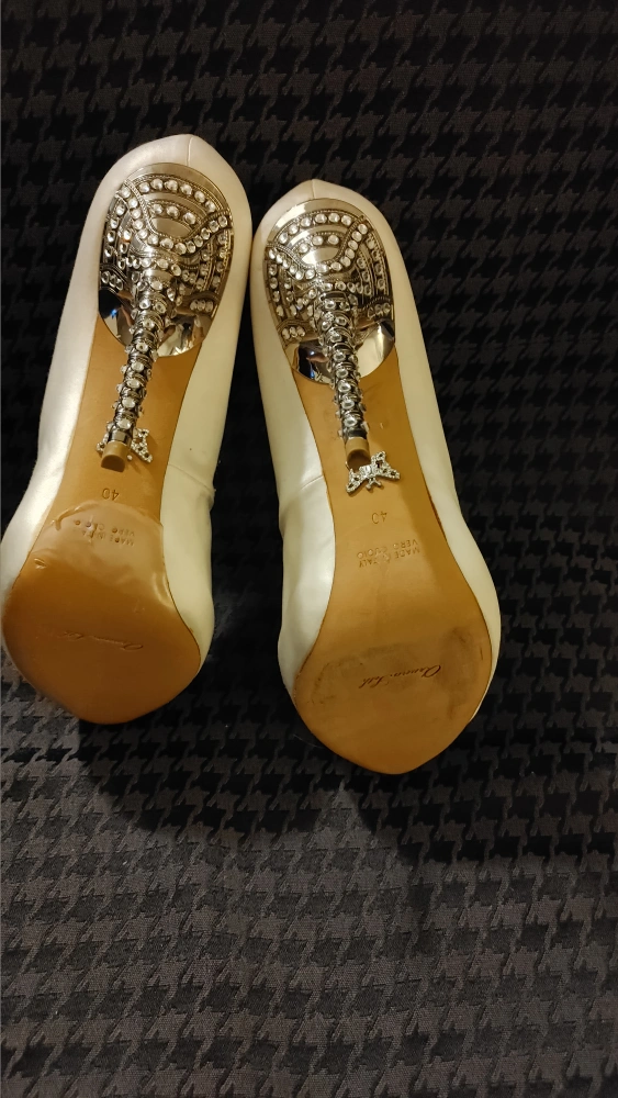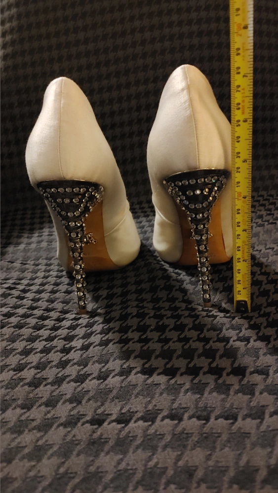 White satin peep toe heels with a crystal embellished heel. Heel height approx. 4.75 inches. Worn in bridal fashion shows. Made in Italy.