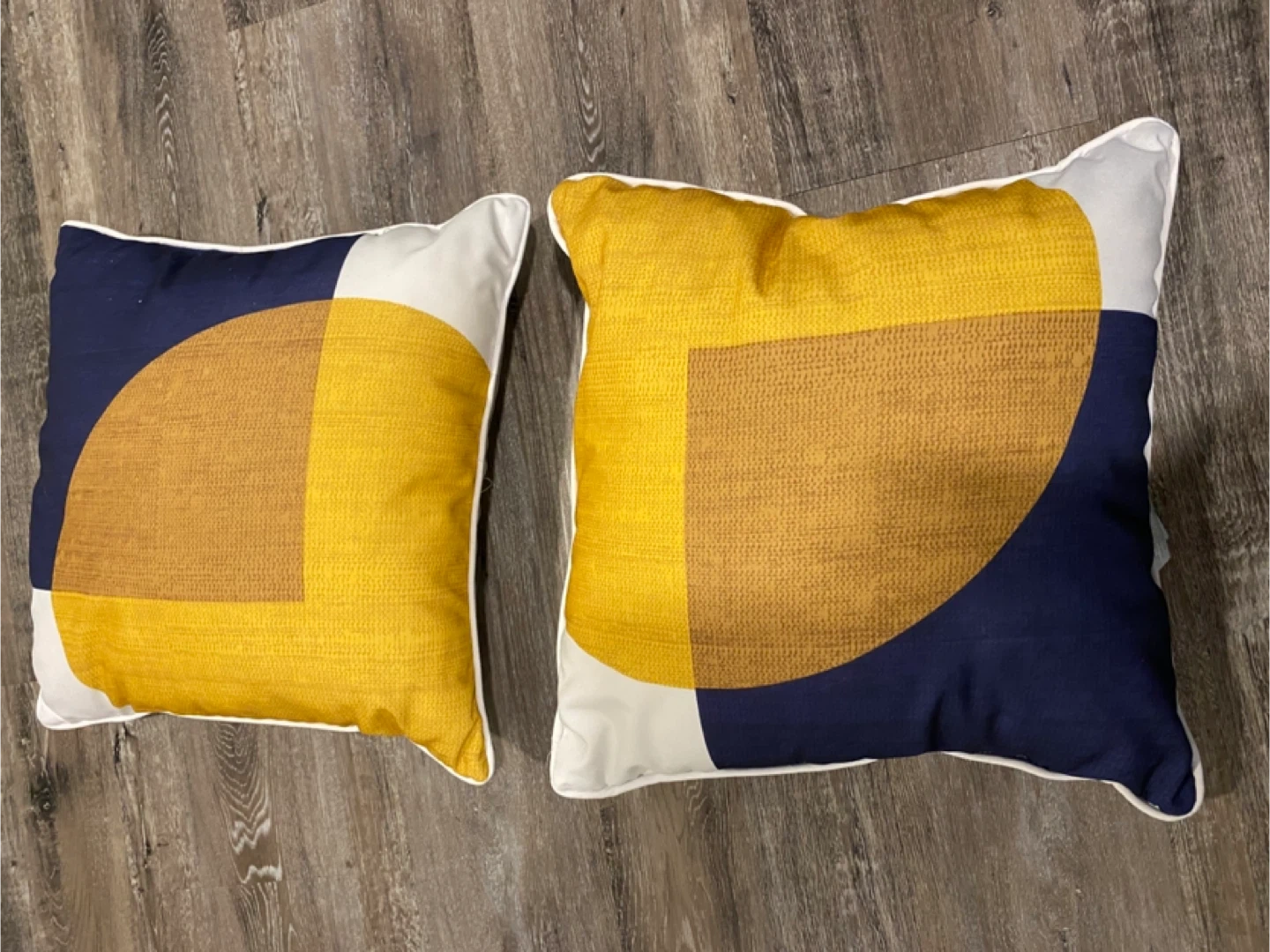 Selling a set of two decorative throw pillows! One side is a solid neutral colour and the other is a geometric pattern of navy, yellow and tan. They're in great condition and would look great on a couch or bed Never used outside Pick up Sage Hill NW Cash only Pet and smoke free home Check out my other listings