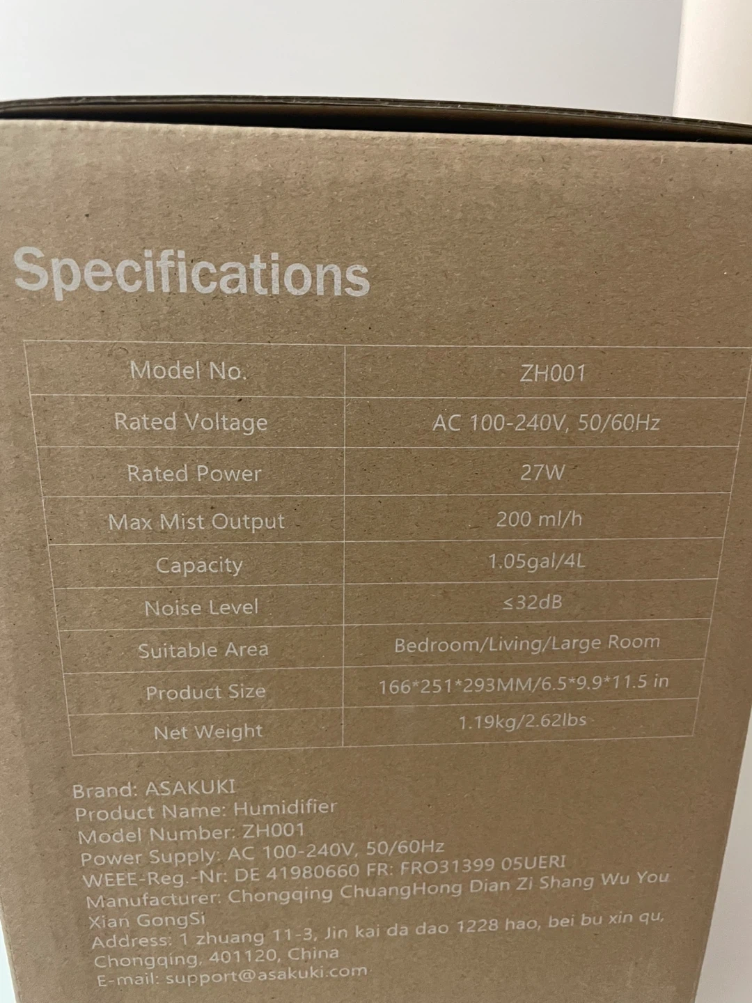 Selling a brand new ASAKUKI Ultrasonic Cool Mist Humidifier, still in its original box! It features easy control, a 4L large capacity, a night light, aromatherapy, a top fill design, and is leak-proof. Perfect for a bedroom or living/large room. The product size is 166*251*293MM / 6.5*9.9*11.5 in and it weighs 1.19kg/2.62lbs