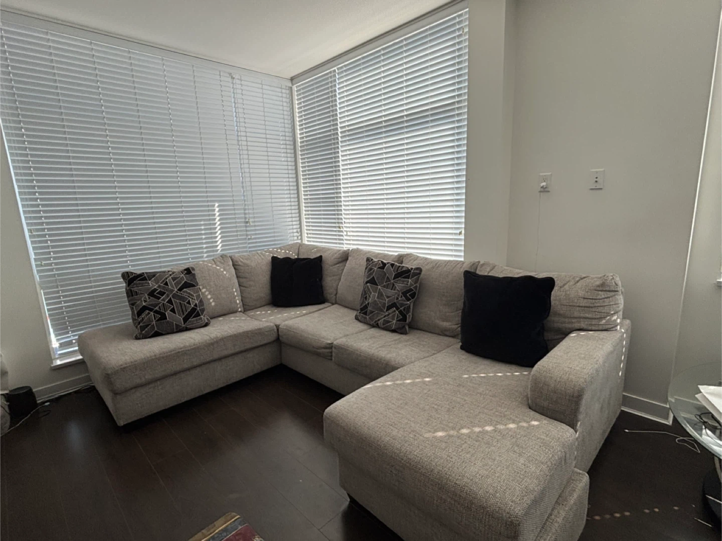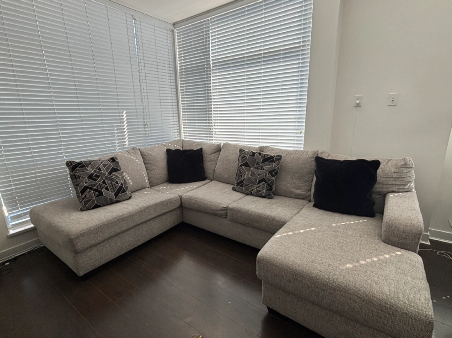 Its a branded Ashley with one adjustable seat. Selling a comfortable sectional sofa in light grey. It's in great condition and would be perfect for a living room or entertainment space. The sofa features a chaise lounge and comes with decorative pillows as pictured. It's a great size for relaxing and entertaining guests!