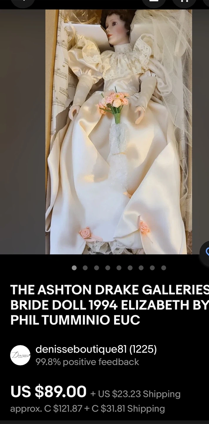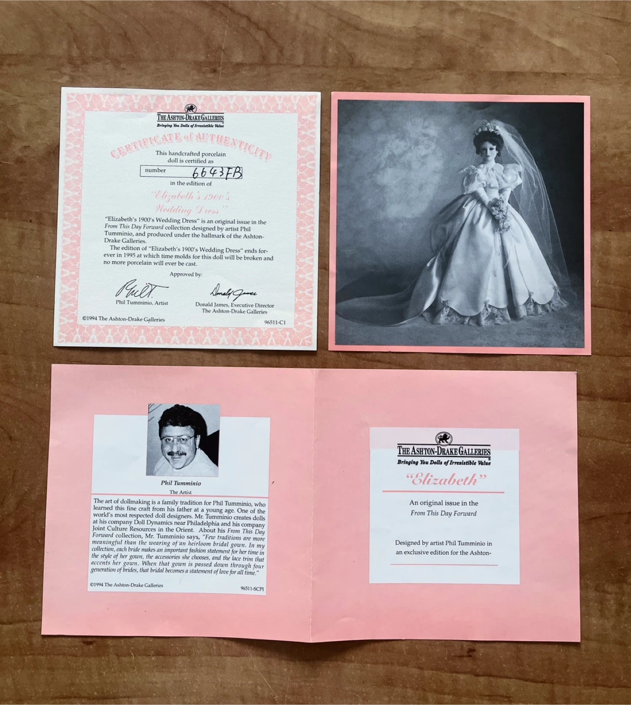 Selling an Ashton Drake Galleries 'Elizabeth' Bride Doll from 1994 designed by Phil Tumminio. This handcrafted porcelain doll is in excellent condition and comes with a certificate of authenticity. A great addition to any doll collection!