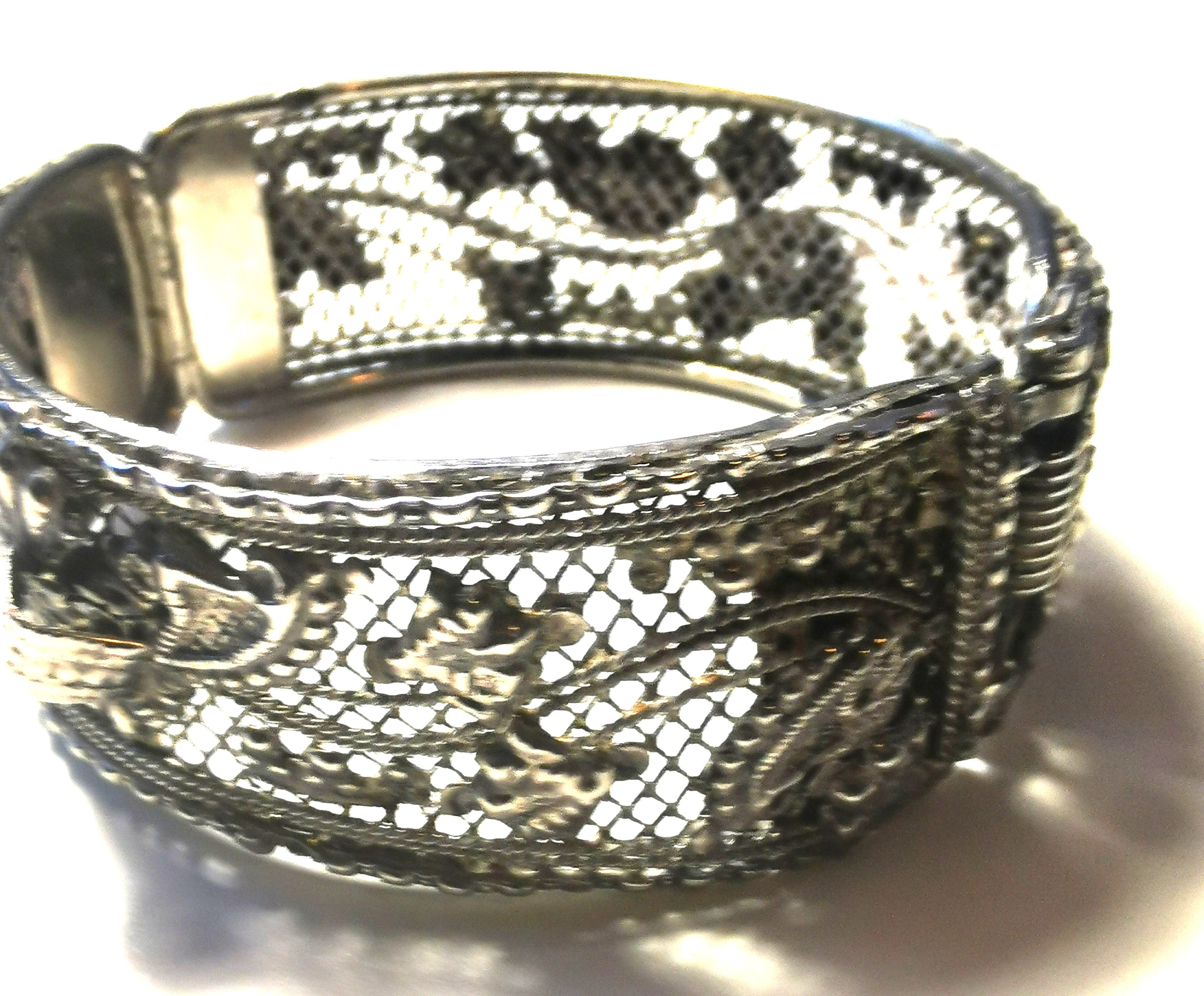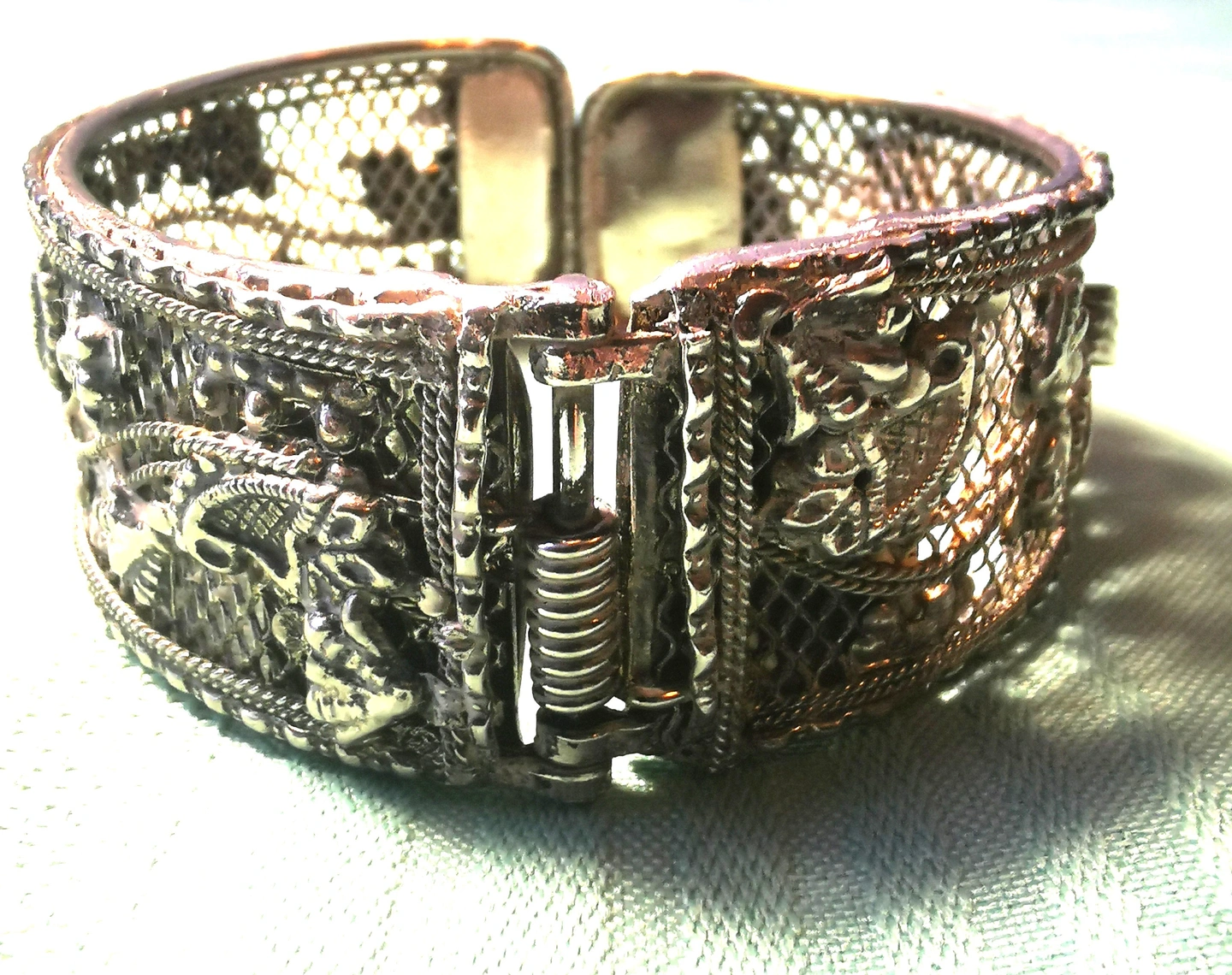 Asian Dragon Cuff Bracelet Vintage Intricate - Silver Tone Mesh