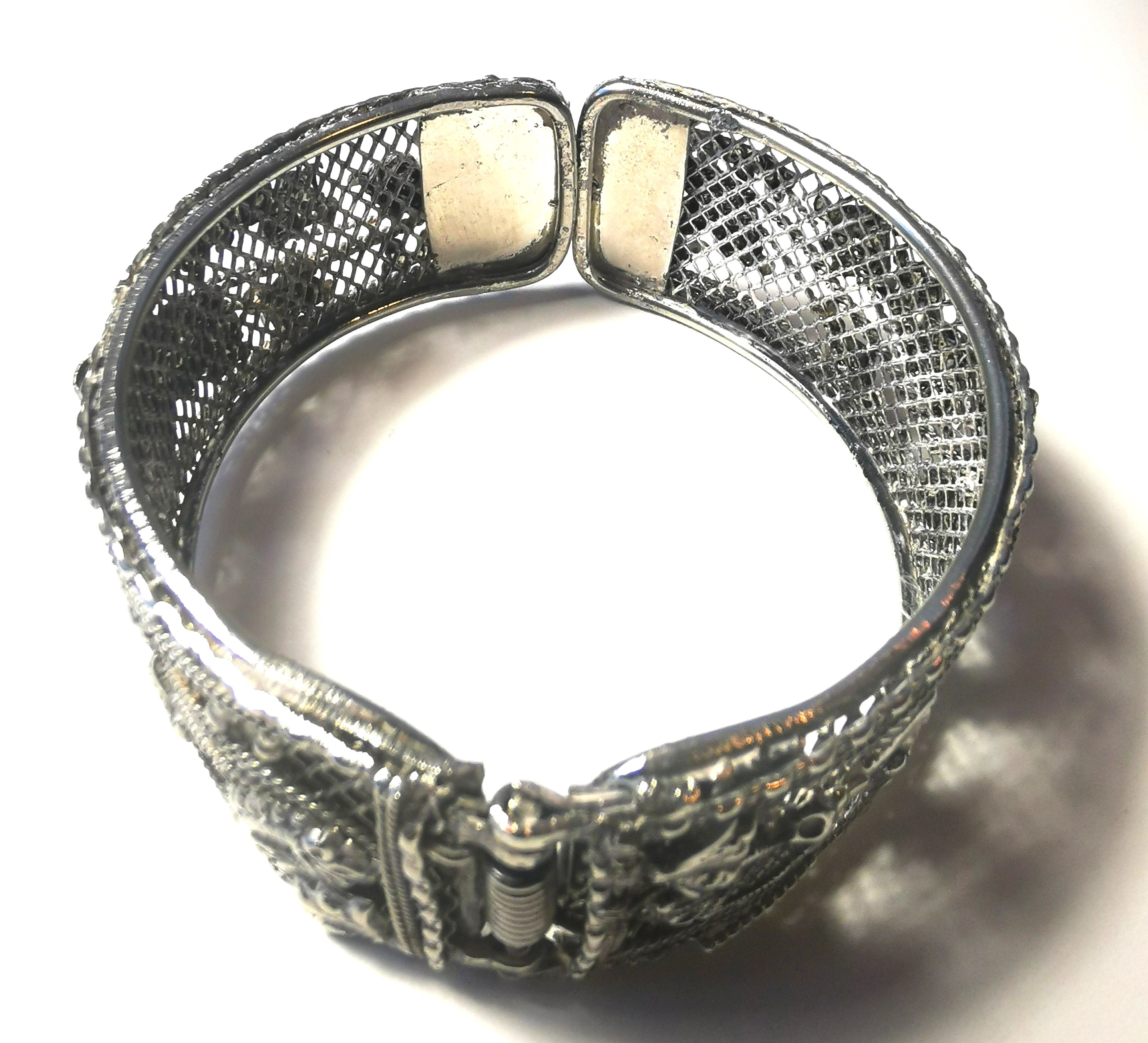 This Asian Dragon Cuff Bracelet is a vintage statement piece with an intricate silver tone mesh design. The cuff style bracelet is perfect for adding a touch of medieval flair to any outfit, ideal for an anniversary gift. The piece is not signed and features a clasp closure for comfort. With its unique and original design, this bracelet is sure to make a statement and become a timeless accessory. CONDITION: Good vintage light wear as per photos
