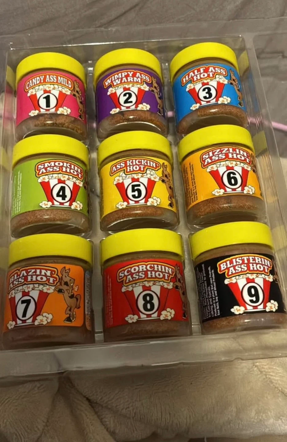 Selling a set of Ass Kickin' Hot Sauces! This set includes 9 different heat levels, from Candy Ass Mild to Blisterin' Ass Hot. A fun gift for the hot sauce lover in your life!