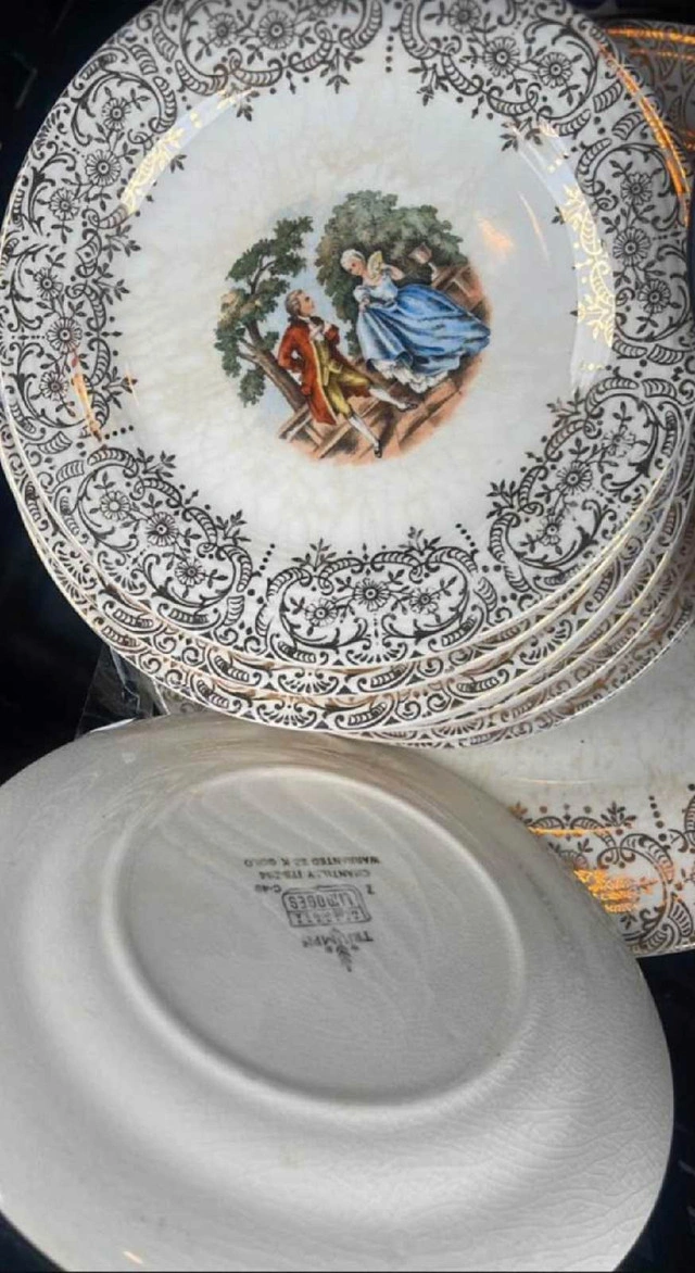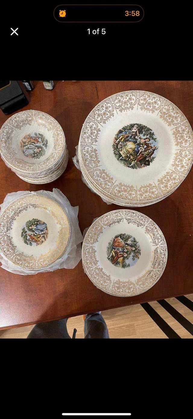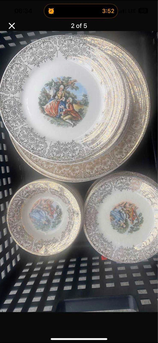 48 assiettes Romio et Juliette 22 Carats Gold pas de crack, pas de tache c'est en bon état age plus que 55 ans une pièce vraiment rare Si vous-avez des questions dites moi Cash accepted