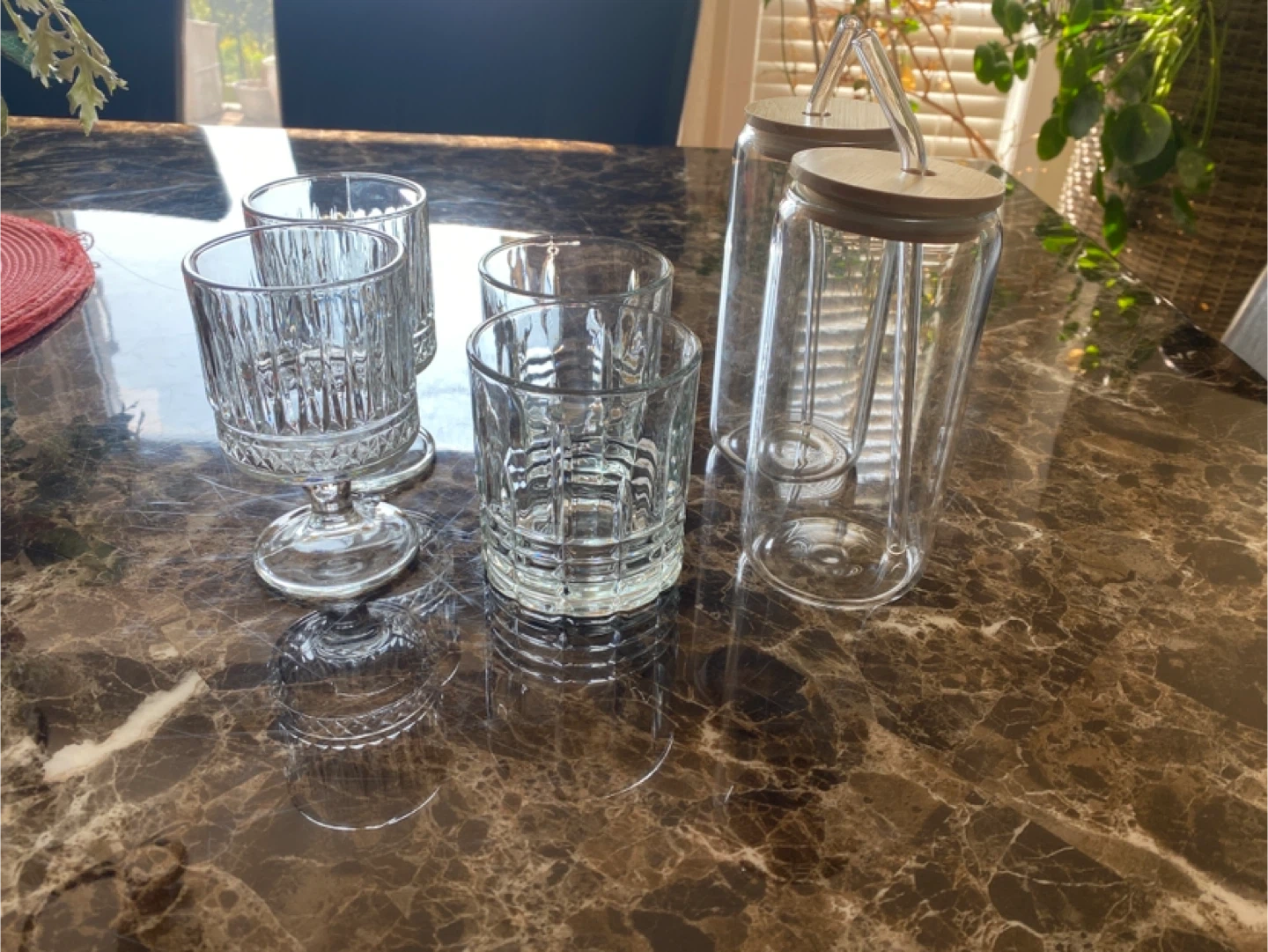 Selling a total of 6 glass cups in great condition! There are two different styles of glass cups in this set. Perfect for everyday use!