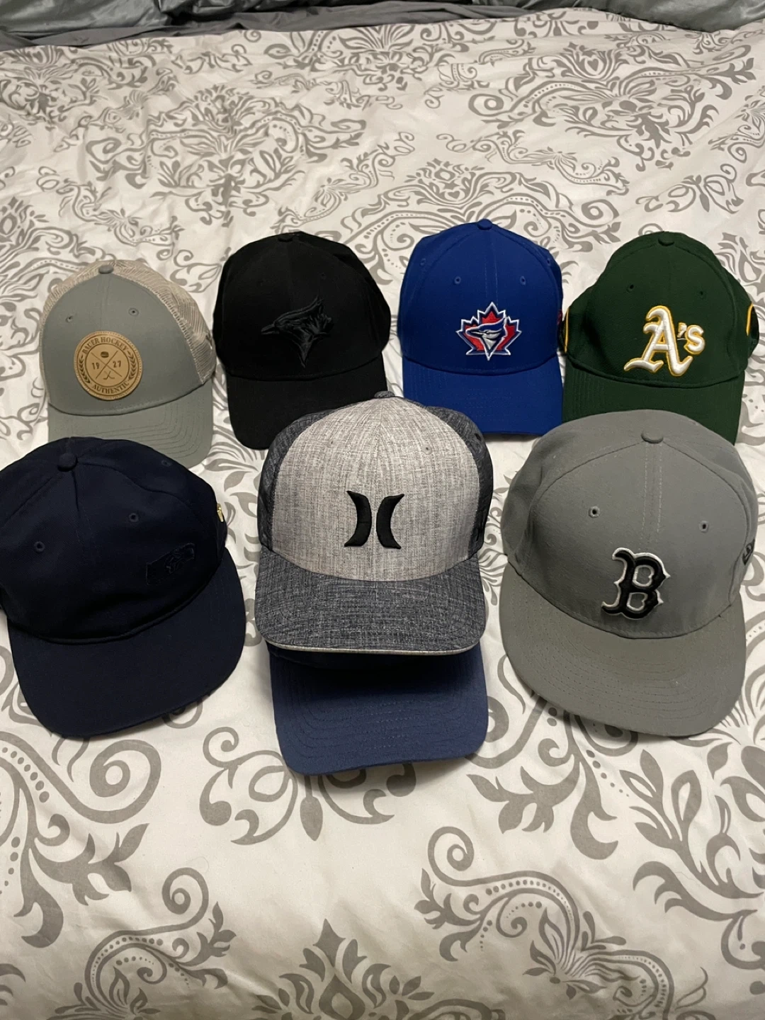 $10 EACH Selling a collection of baseball caps! Different sizes. There's a variety of brands and teams, including: - Hurley (grey and blue) - Toronto Blue Jays (blue) - Oakland Athletics (green and yellow) - Seattle Seahawks (navy blue, New Era) All in great condition and ready for a new home!