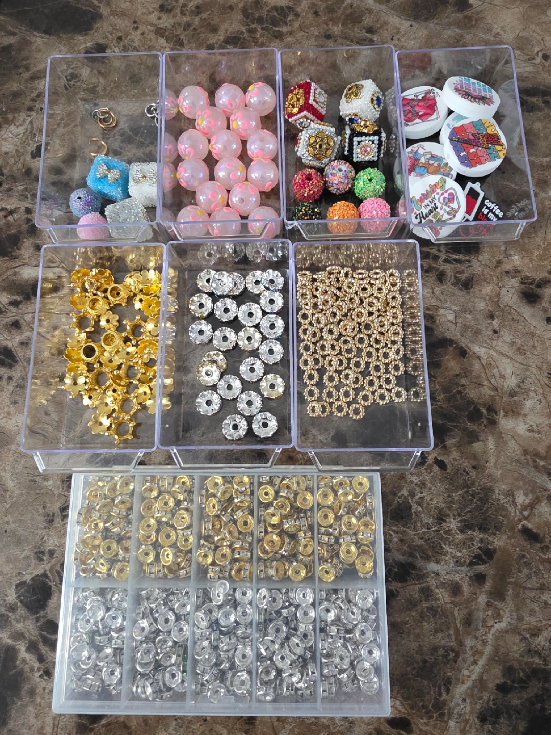Selling a variety of beads and findings, perfect for jewellery making and other crafts! There are different colours, shapes and sizes to choose from. Great for adding some sparkle to your next project containers not included