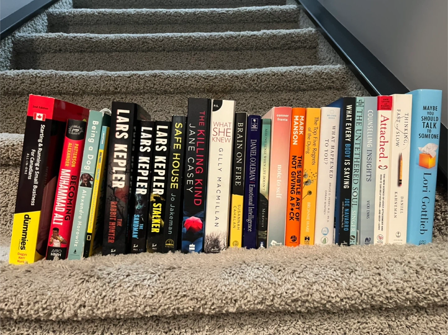 Selling a collection of books, including novels like Lars Kepler's series and Jane Casey's 'Safe House', and self-help books like 'The Subtle Art of Not Giving a F*ck' by Mark Manson and 'Maybe You Should Talk to Someone' by Lori Gottlieb. Also included is 'Starting & Running a Small Business for Canadians' for those interested in entrepreneurship