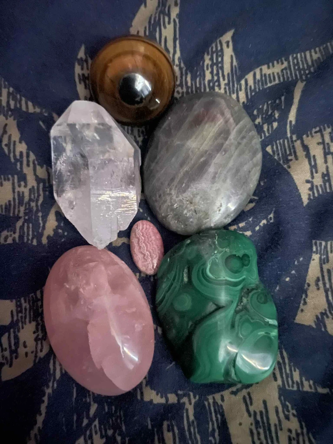 Selling a collection of beautiful assorted crystals! Includes: clear quartz, (has water in it; enyhro quartz point), theres a labradorite palm stone, malachite polished chunk, rose quartz palm stone, rhodochrosite cabochon (not wire wrapped), and tigers eye sphere. worth around $160 all together. Perfect for collectors or anyone interested in crystal healing and decor