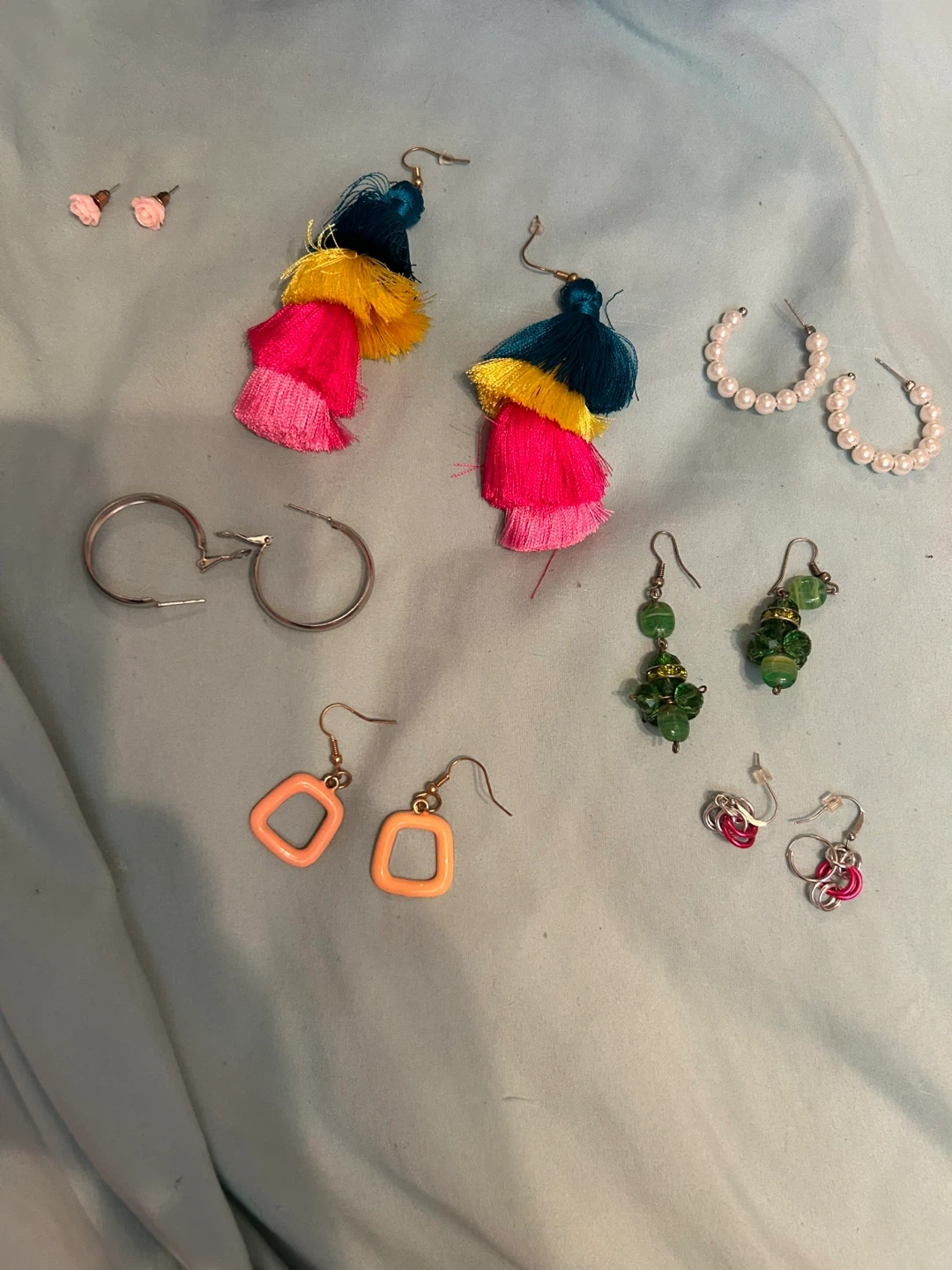 Selling a collection of fun and unique earrings! There's a variety of styles and colours to choose from, including: - Cute pink rose studs - Colourful tassel earrings - Pearl hoop earrings - Silver hoops - Orange square earrings - Green beaded earrings - Red and silver earrings They're all in good condition and ready for a new home!
