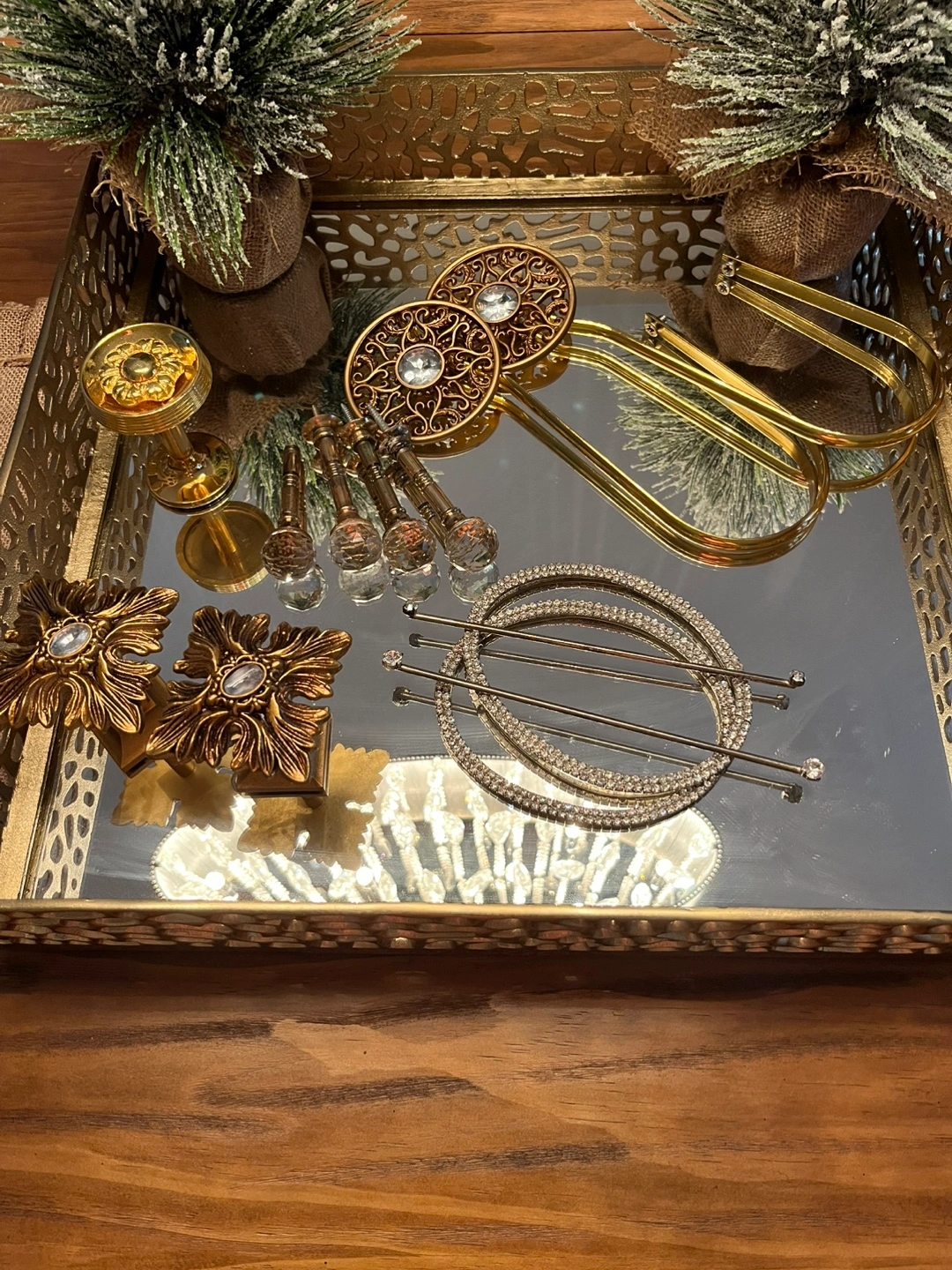 Selling a collection of gold-toned decorative accessories! Includes curtain tie-backs, drawer pulls, and jeweled hair accessories. Perfect for adding a touch of elegance to your home or style