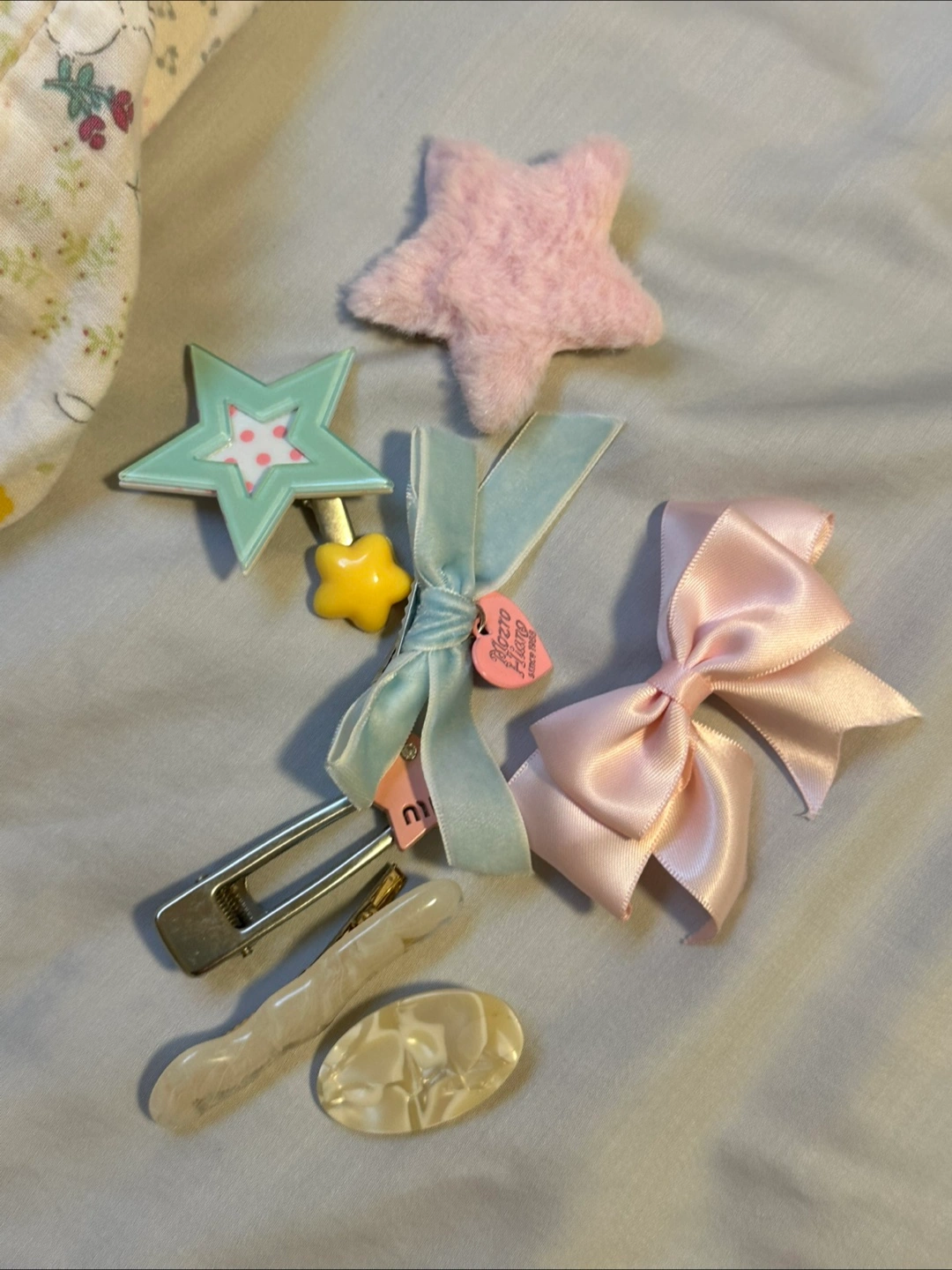 A cute collection of hair clips in various styles! Includes star-shaped clips, a sweet bow clip, and other unique designs. Perfect for adding a touch of fun to any hairstyle