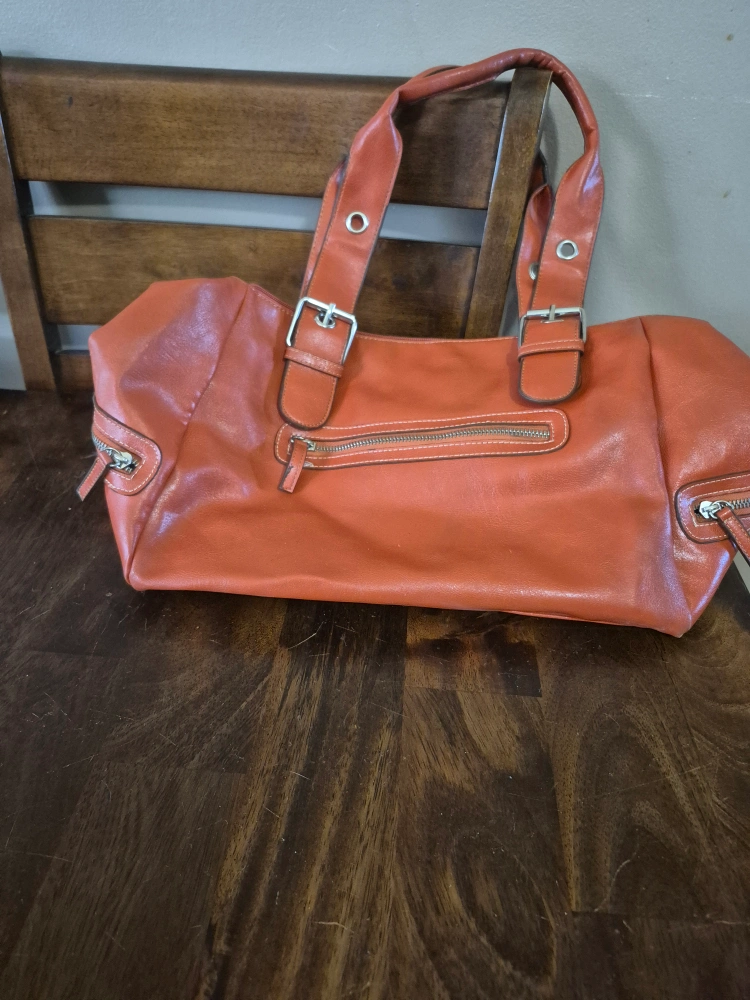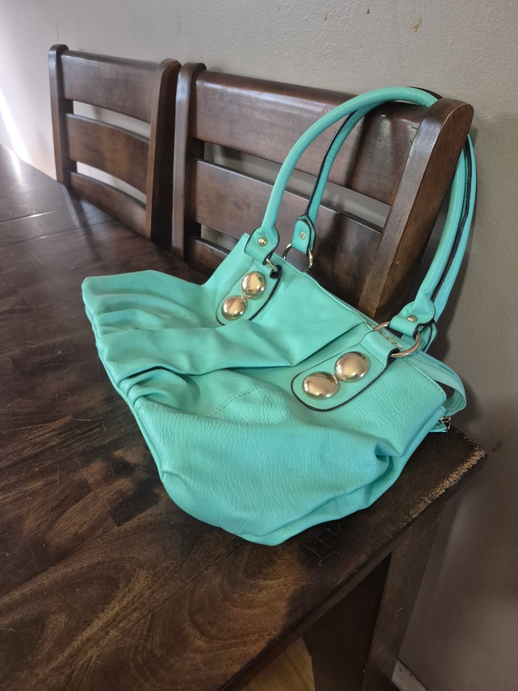 Selling two handbags in used condition. One is a light orange colour, and the other is a light teal colour. Both have some signs of wear, but are still in good condition.