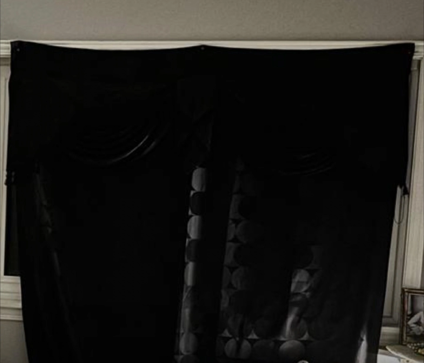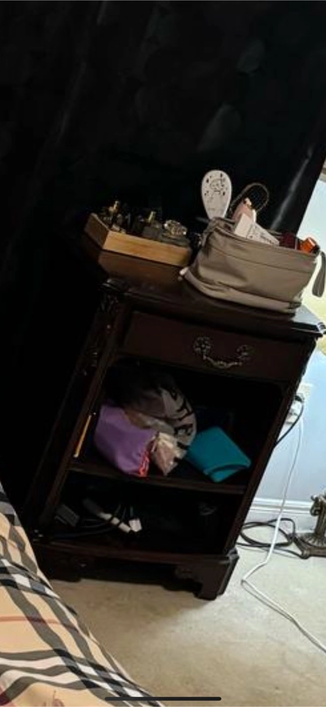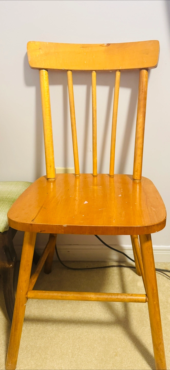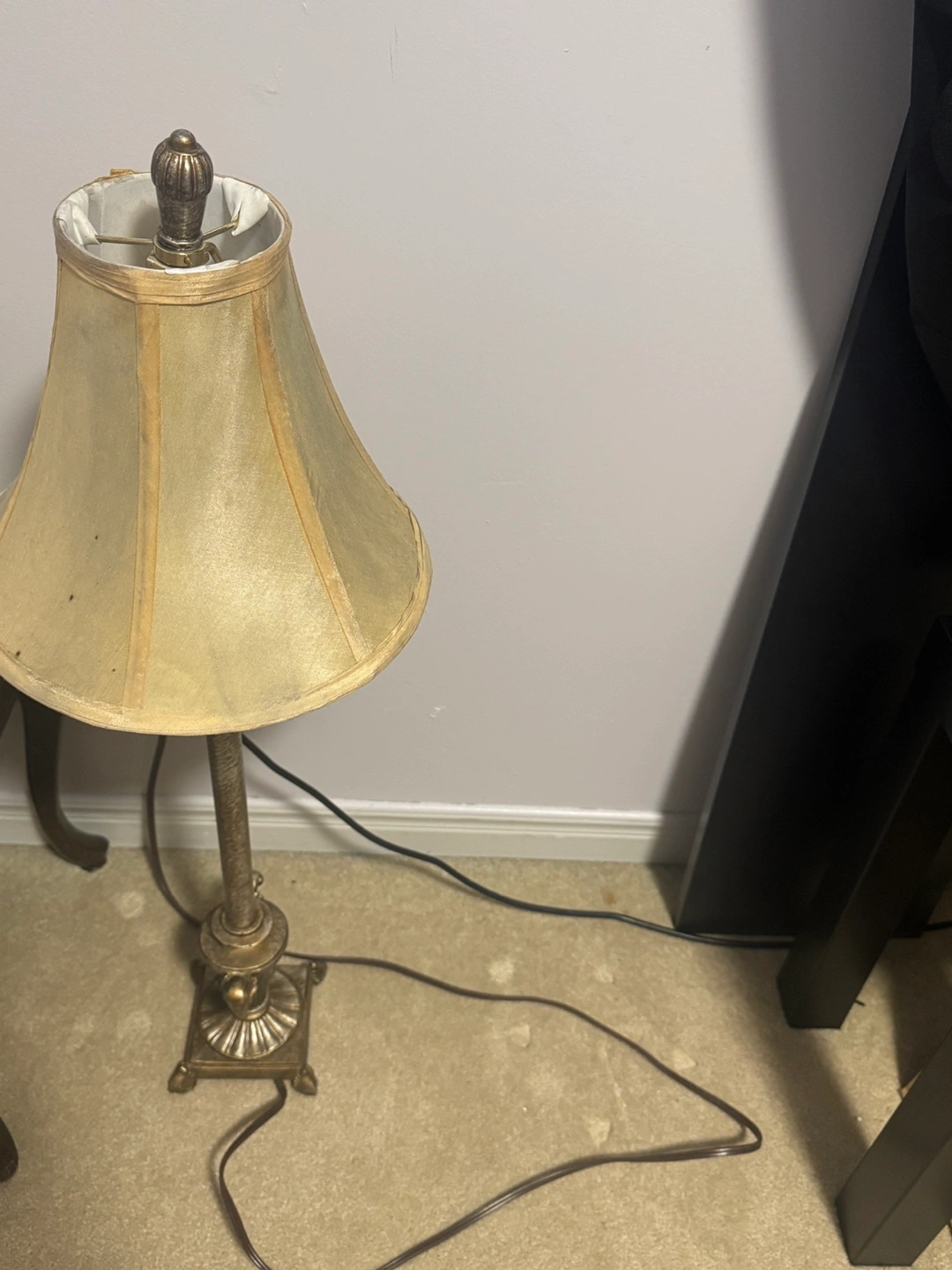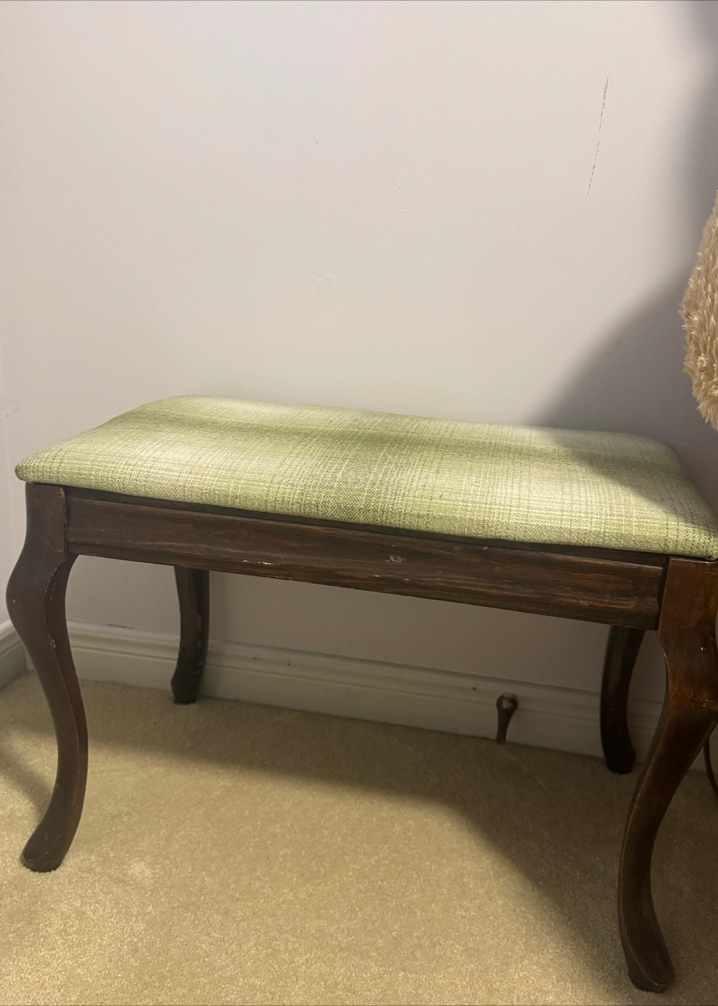 Selling a variety of home decor items. Includes a wooden chair, a full-length mirror, black curtains, an upholstered bench, and a vintage lamp. All items are in used condition.