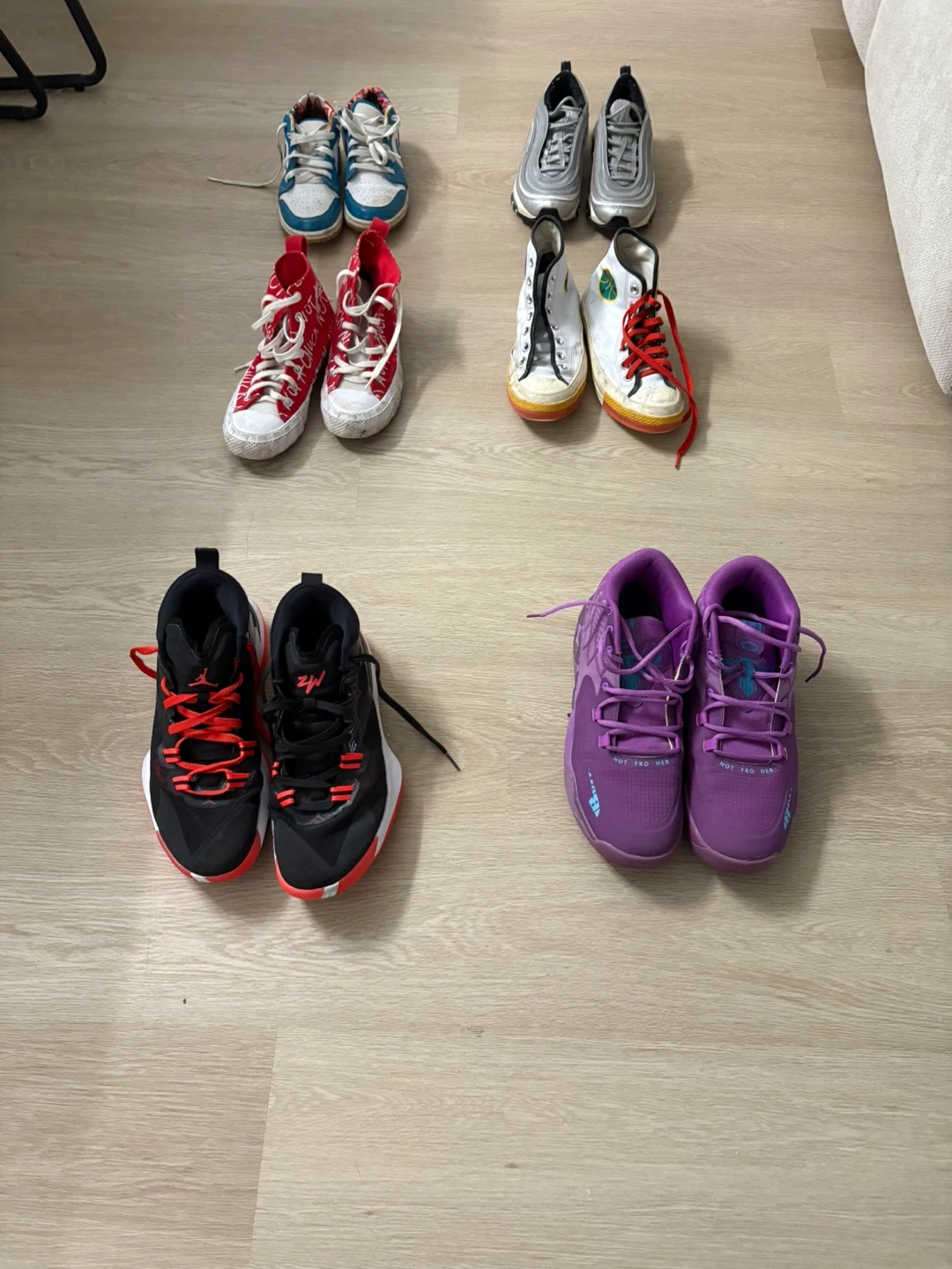 Selling a collection of gently used kids' shoes in various sizes and styles: - Nike Air Max 97 (Size 5.5) - Converse Chuck Taylor All Star (Size 5.5) - Nike Basketball Shoes (Size 10.5) - And more! Sizes range from 4.5 to 11.5 Please Message Me for Price inquiries ๐