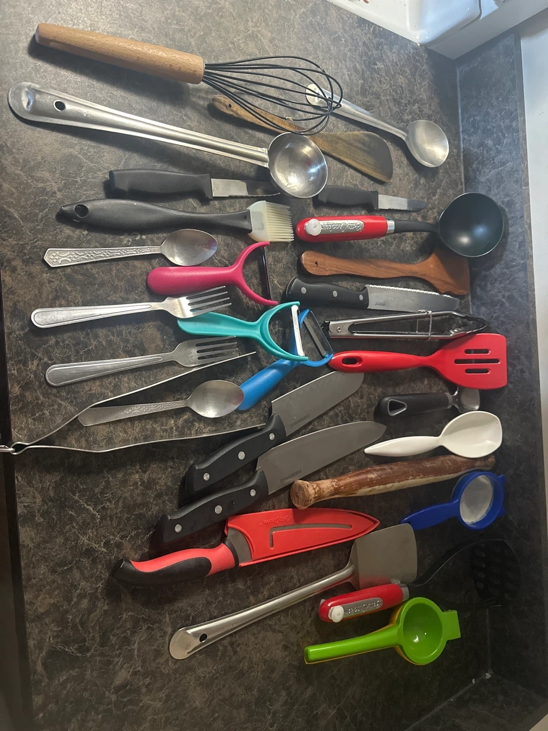 Selling a variety of kitchen utensils, including knives, spoons, ladles, whisks, and more! Perfect for stocking up your kitchen or replacing worn-out tools. Take all home in 20$ as it moving sale.