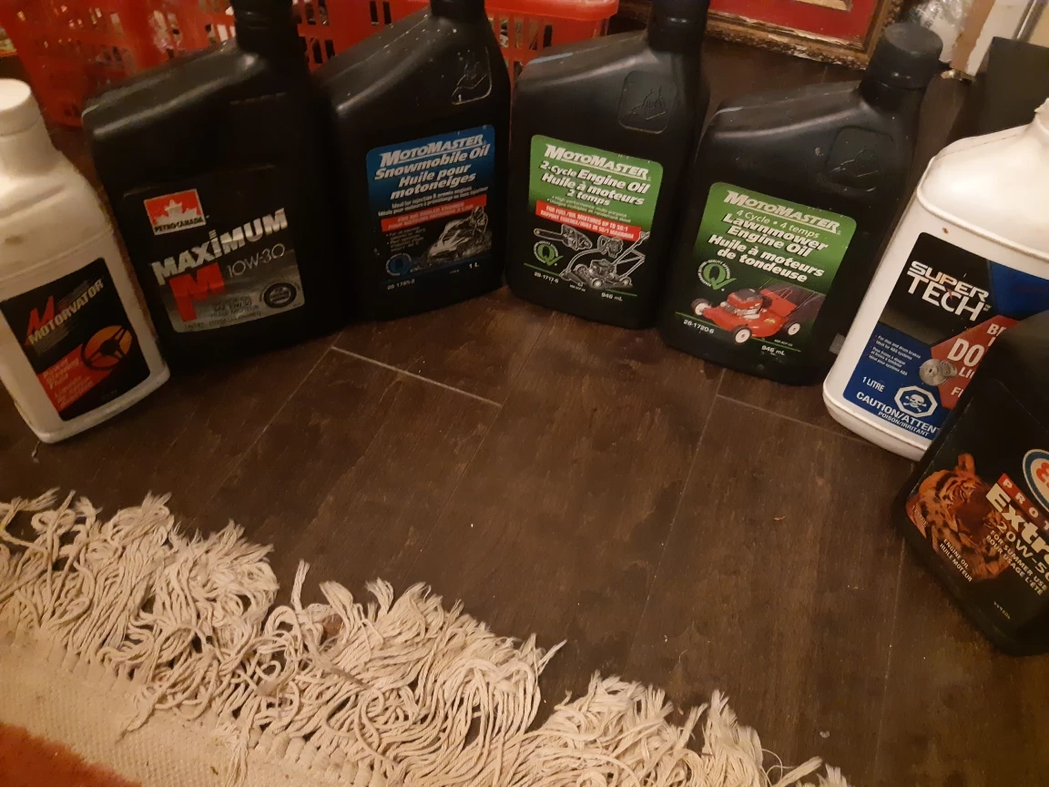 Collection of various motor oils. Includes Motomaster snowmobile, 2-cycle, and lawnmower oils. Also, Super Tech and Motorvator oils. Various sizes and viscosities.$10 each