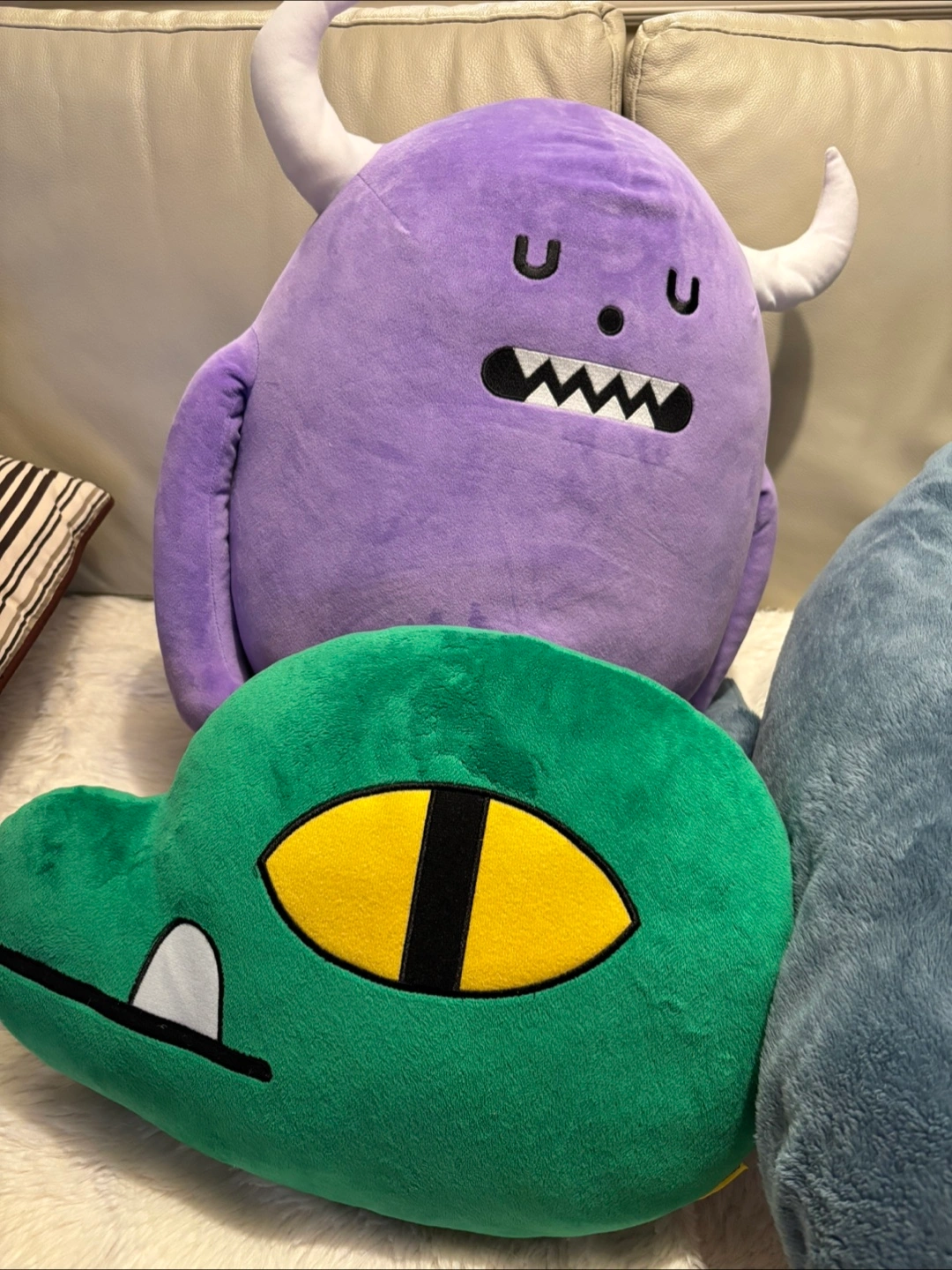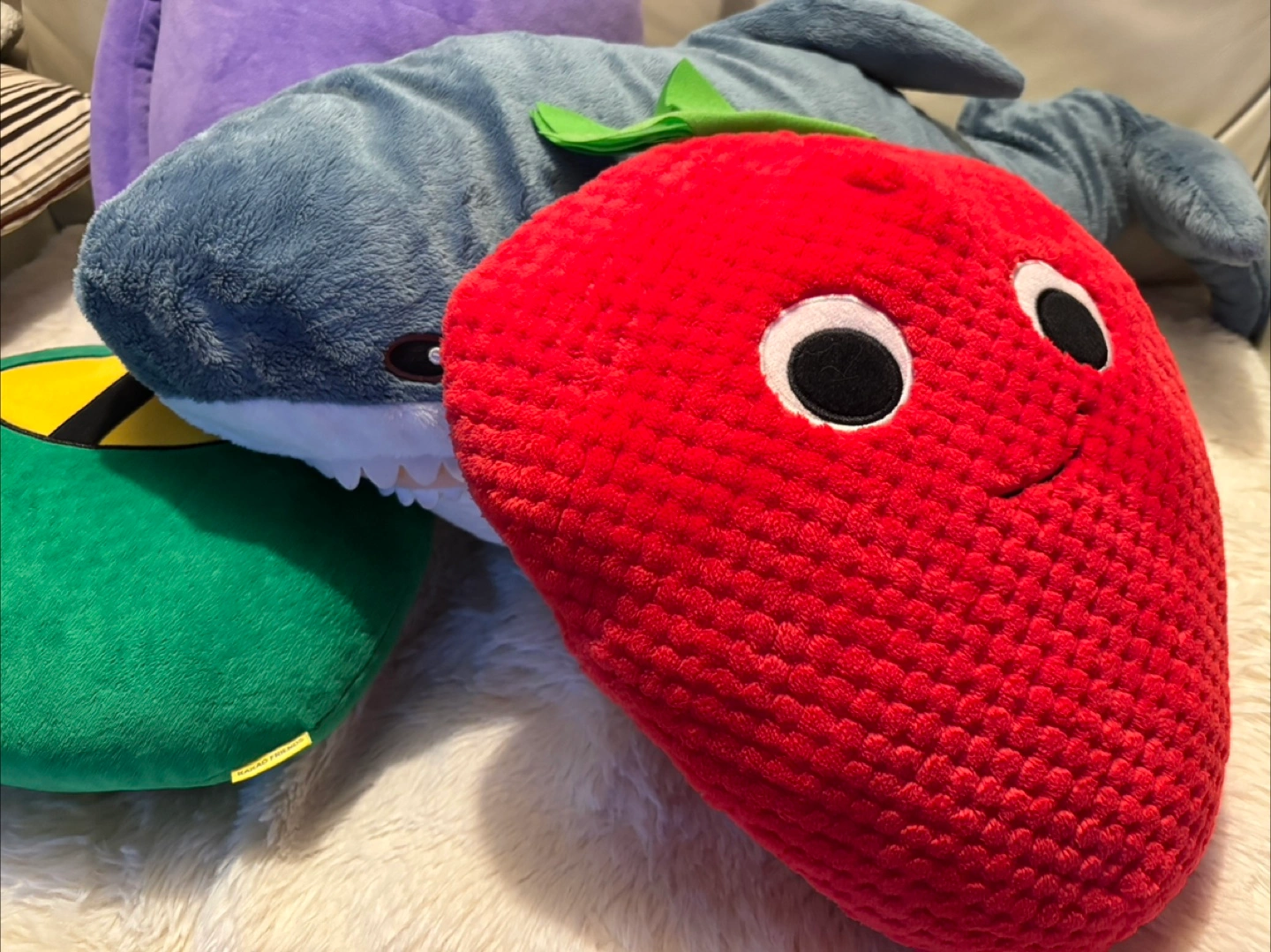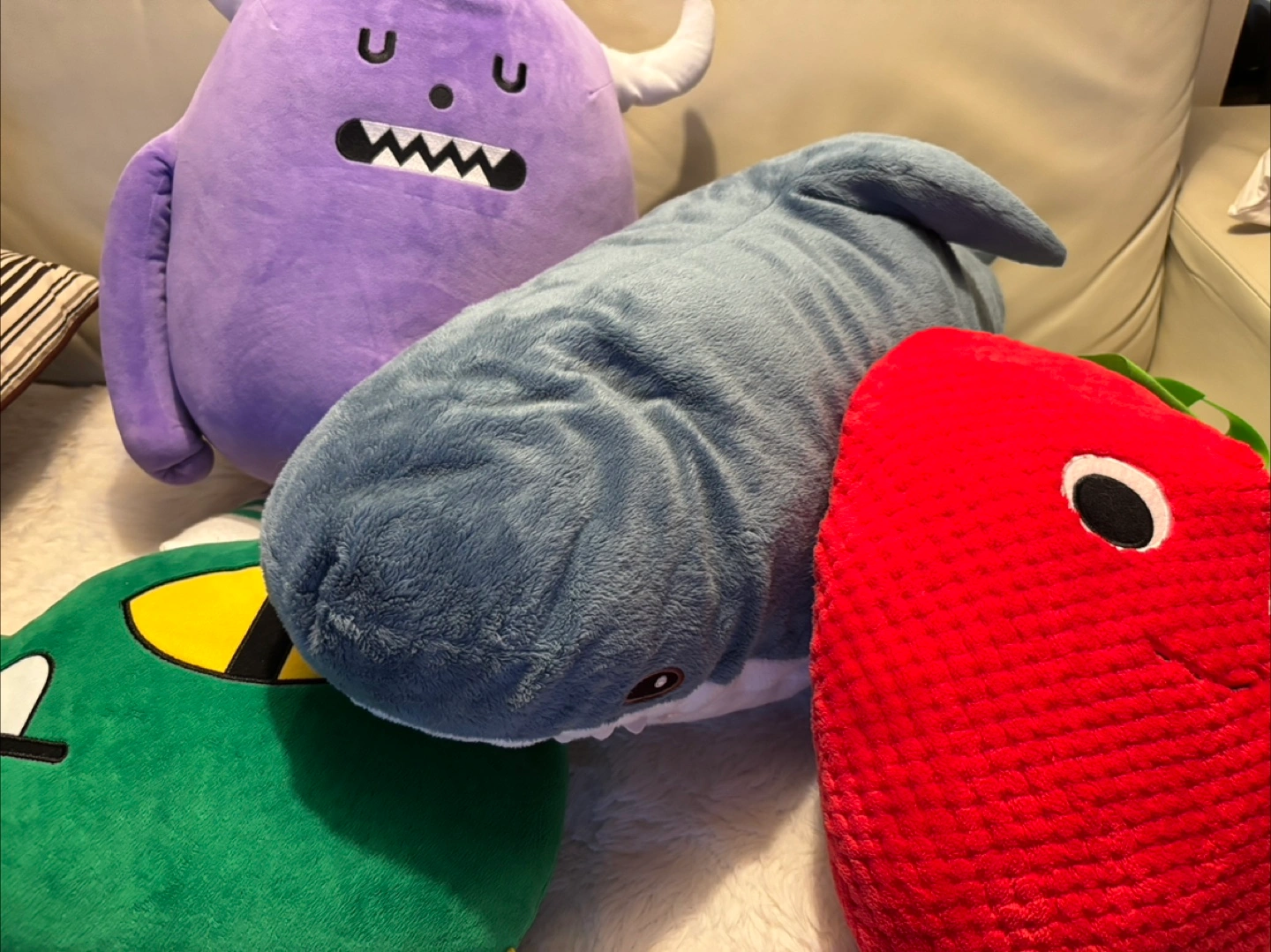 Selling a collection of fun plush pillows! There's a purple monster, a green alligator, a shark, and a red strawberry. They're all in great condition and ready for a new home!