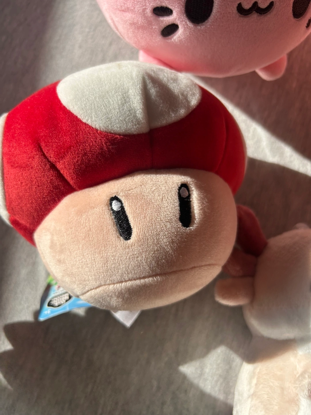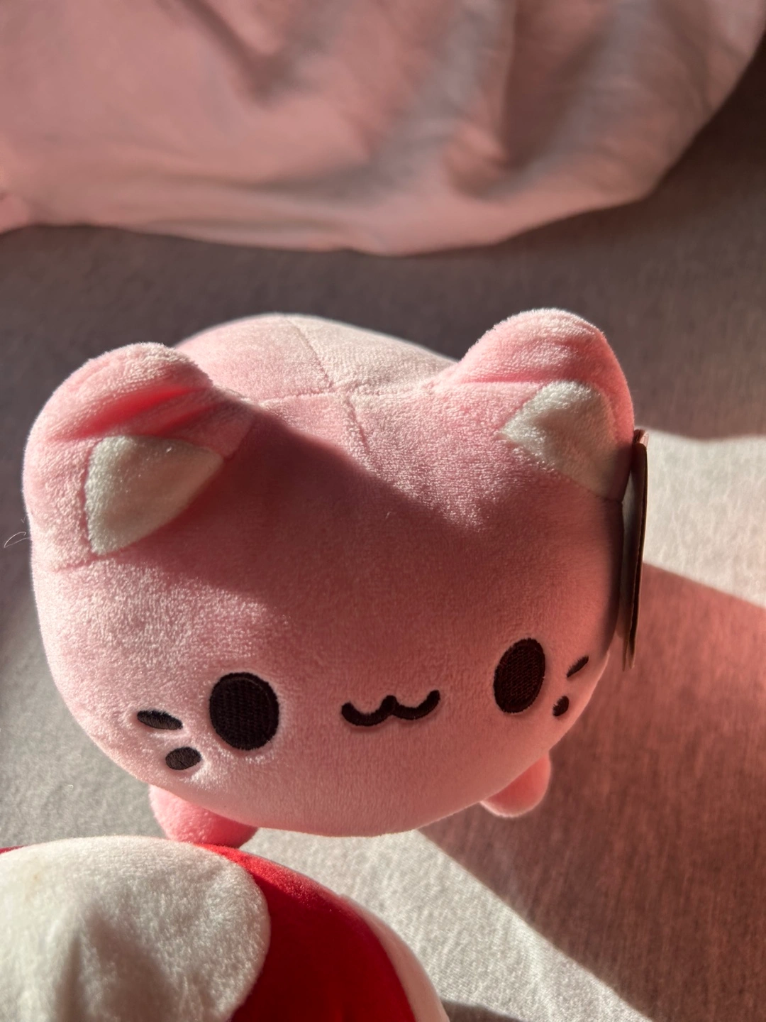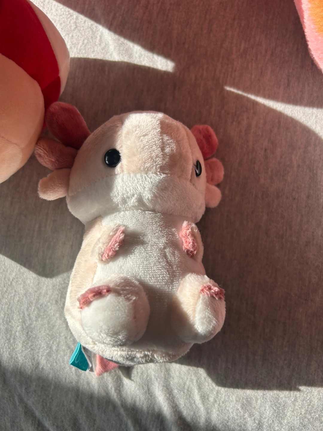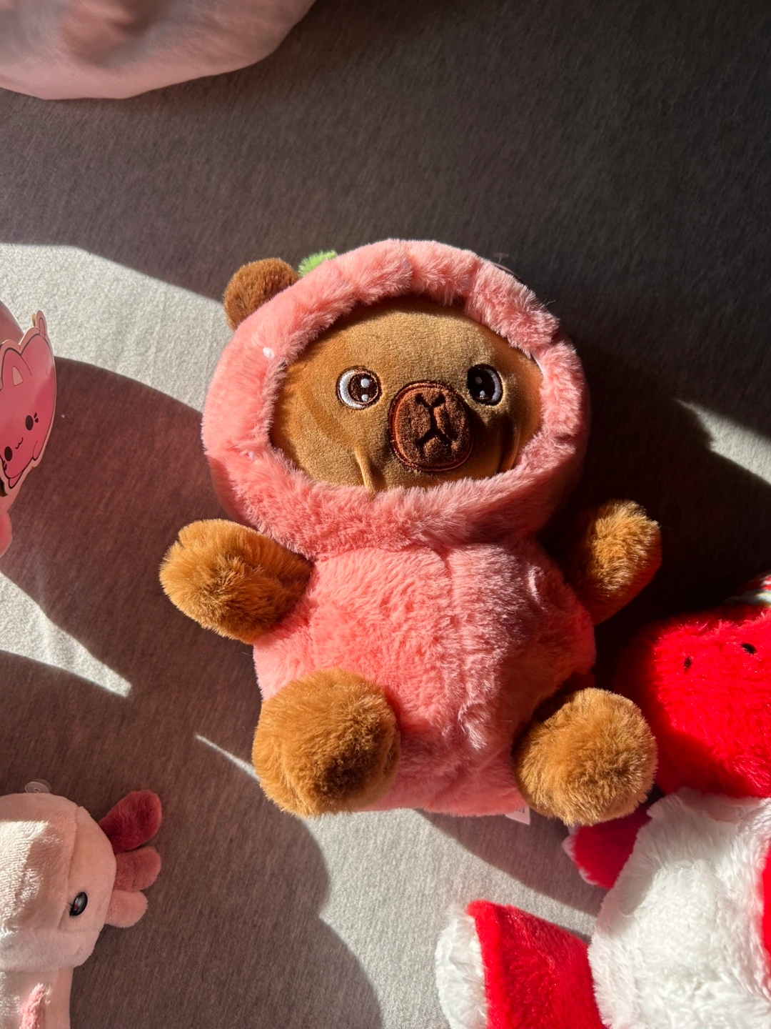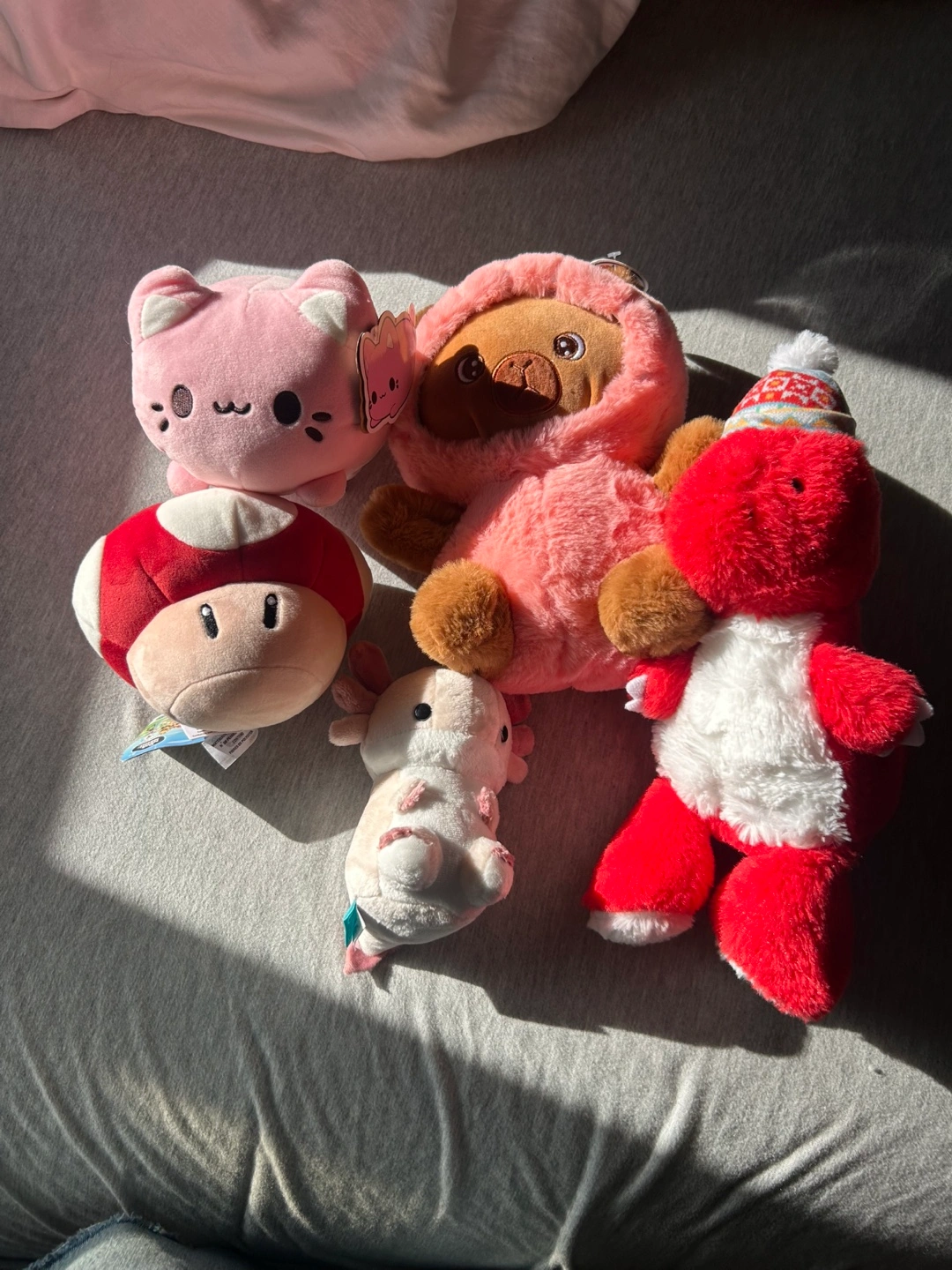 Selling a collection of cute plush toys! Includes a strawberry capybara , a pink cat, a mushroom, an axolotl, and a red dinosaur. Perfect for kids!