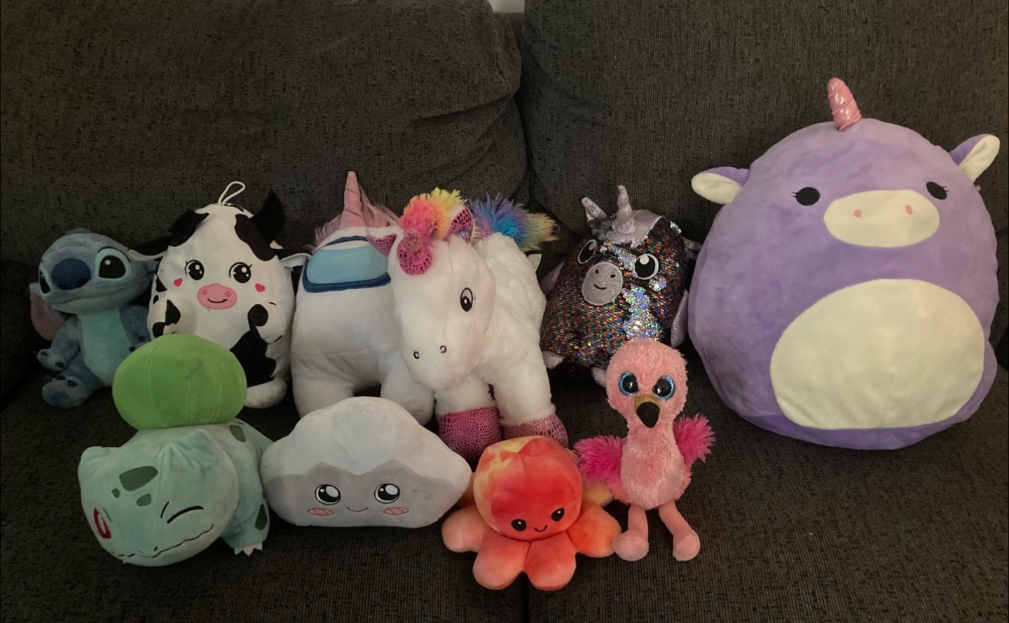 Selling a collection of cute plush toys for my daughter! There's a variety of characters including Stitch, a cow, a unicorn, an octopus, and others. They're all in great condition and ready for a new home to be loved. She’s asking $3 a piece and $10 for the big purple squishmallow or $30 for the whole lot Smoke free home