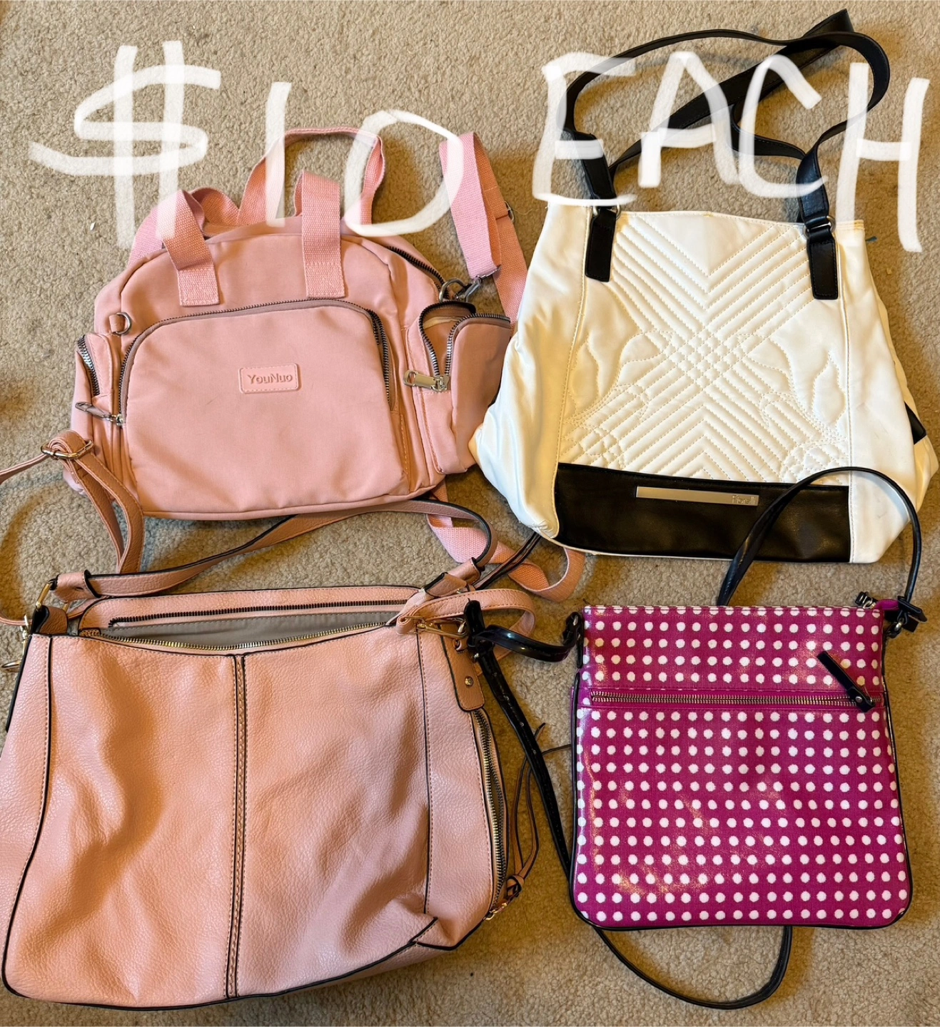 Selling these assorted purses for $10 each! There's a pink backpack, a white and black tote, a larger pink purse, and a cute purple polka dot crossbody bag. Great for adding some variety to your wardrobe.