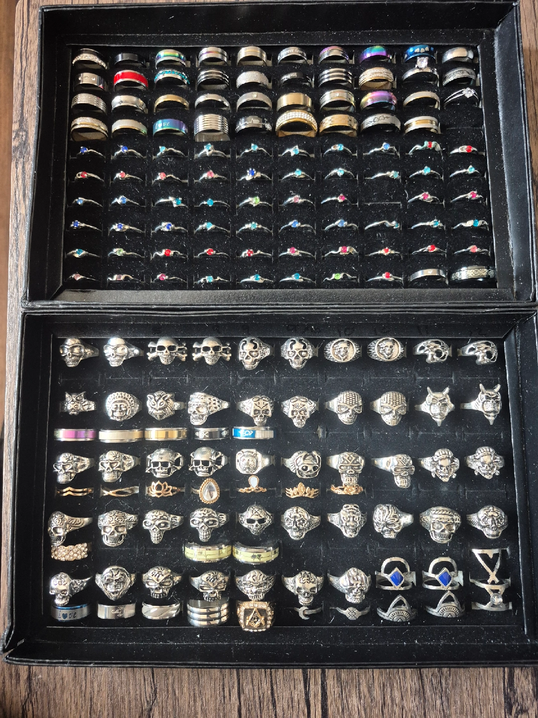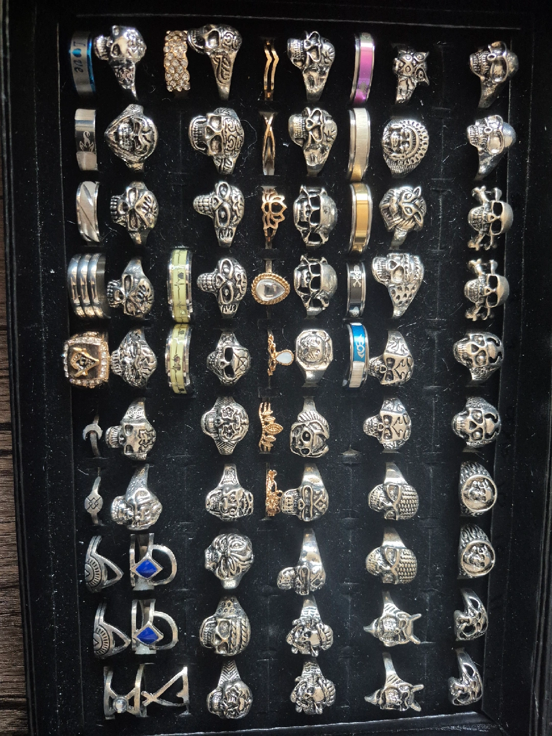 Selling a collection of assorted rings. There are various styles and sizes, including skull designs and gemstone accents. Perfect for adding some flair to your outfits!