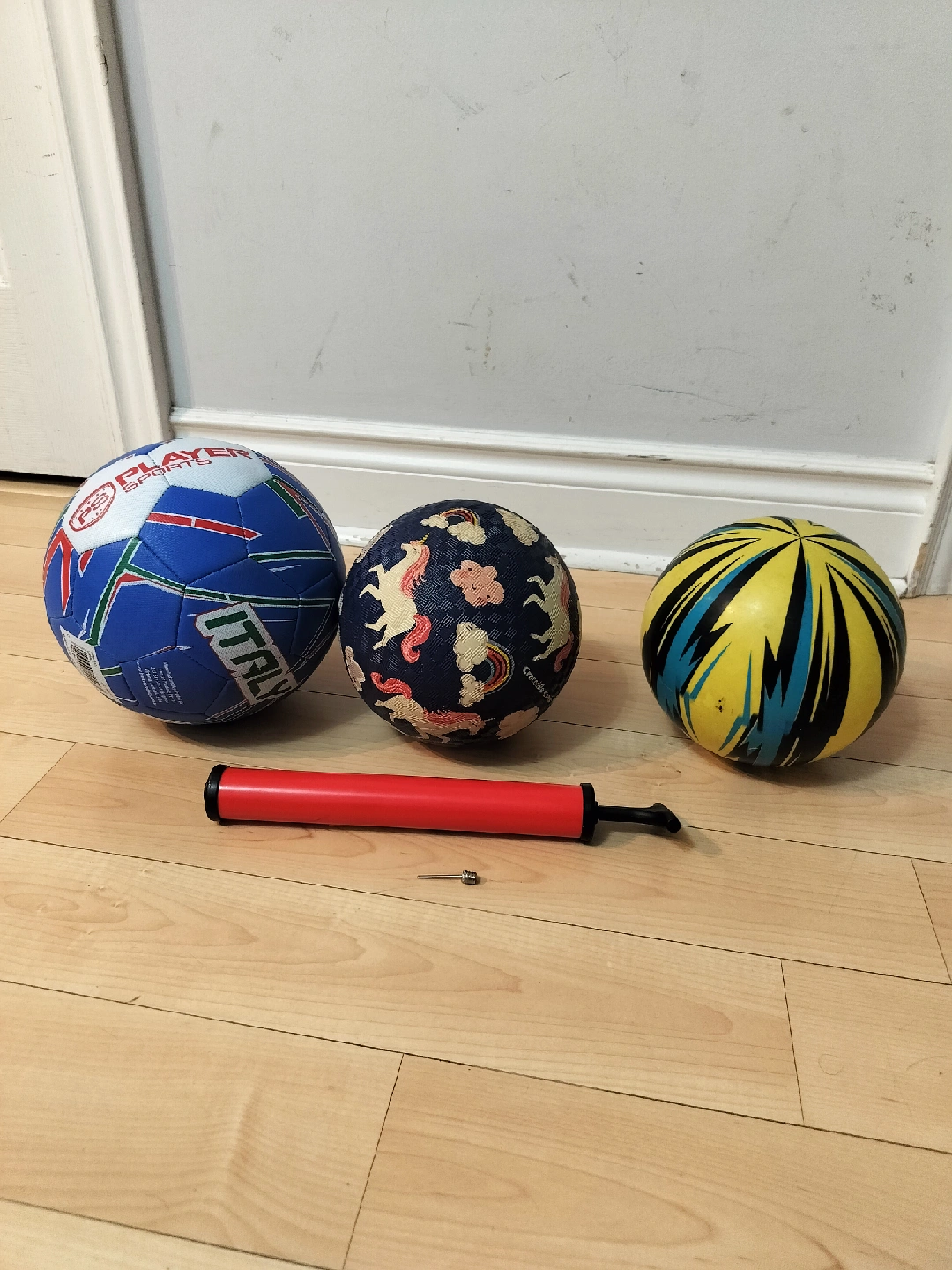 Selling a collection of soccer balls in various designs. Blue one is a good quality size 5 Italy soccer ball - like NEW. Price - $5. Other two balls are for smaller kids. They are used but still in good condition. They are FREE with the soccer ball. Pump is a low quality item, but still works good and does its pumping job nicely. That is also FREE. Pick up location: 23 Cox Boulevard Markham.