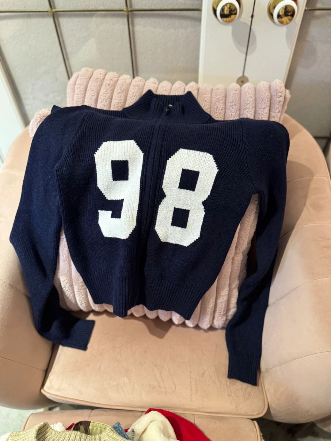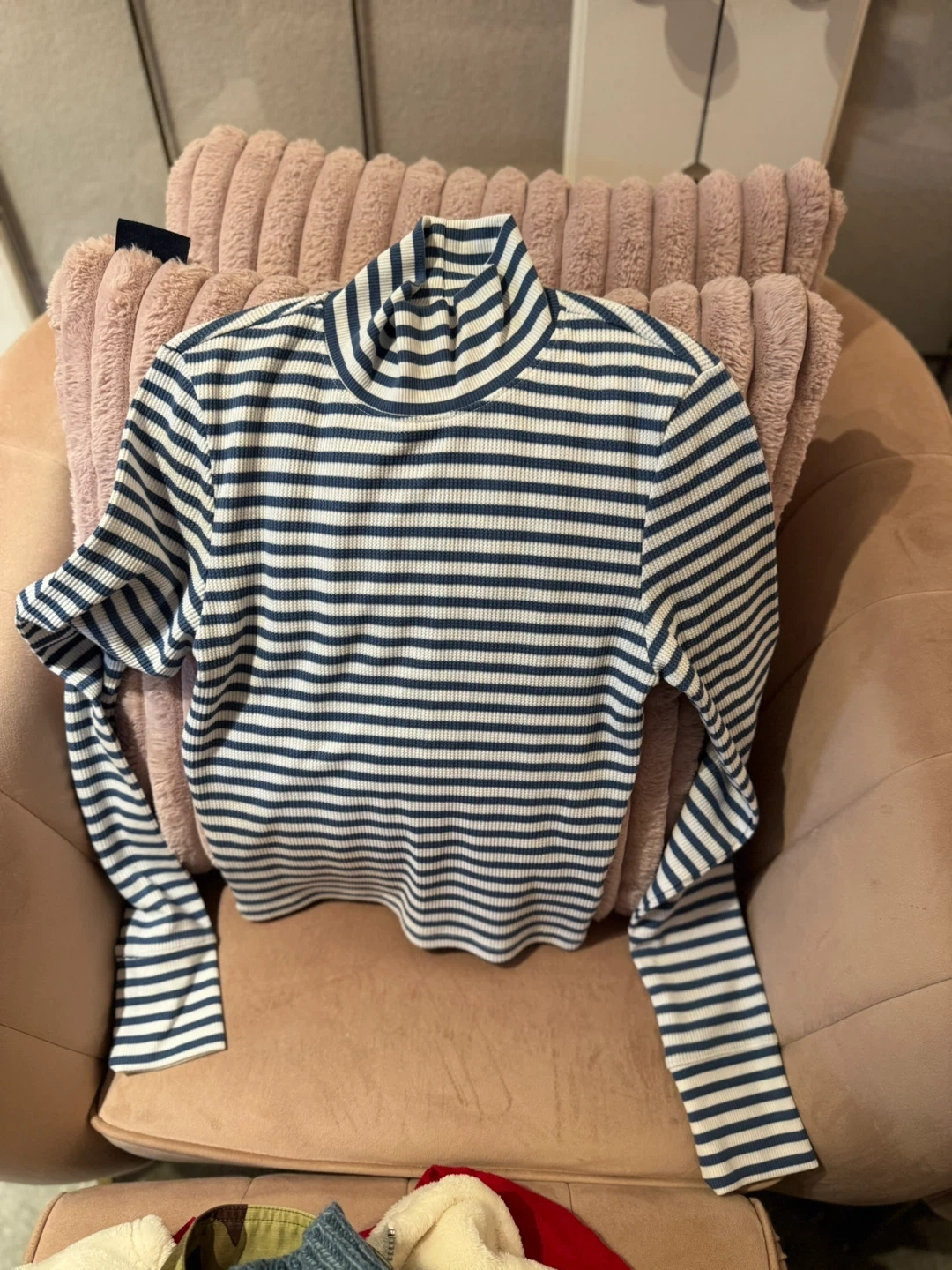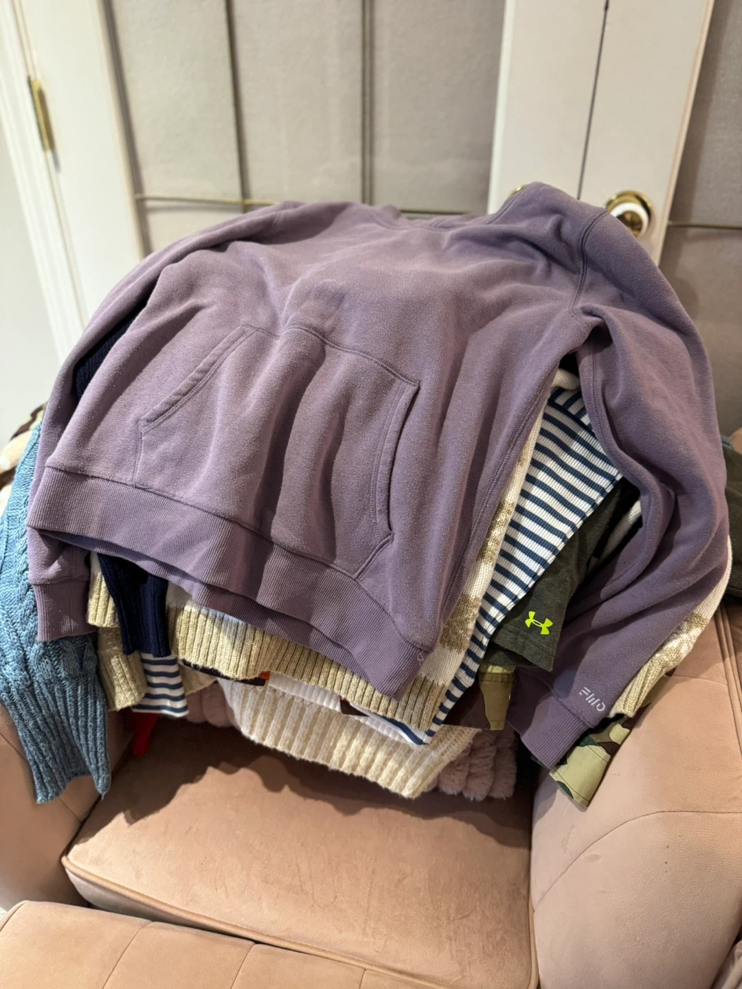 A collection of sweaters and hoodies in good condition. Great for layering or staying cozy on cooler days! Includes a striped turtleneck, a snowflake pattern sweater, an Under Armour hoodie, and a navy sweater with '98' on the back