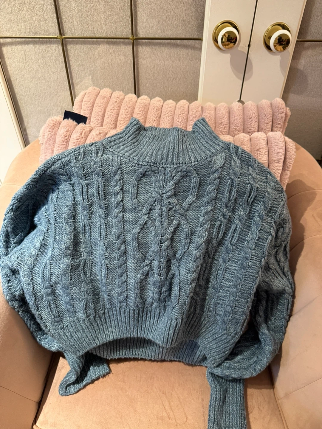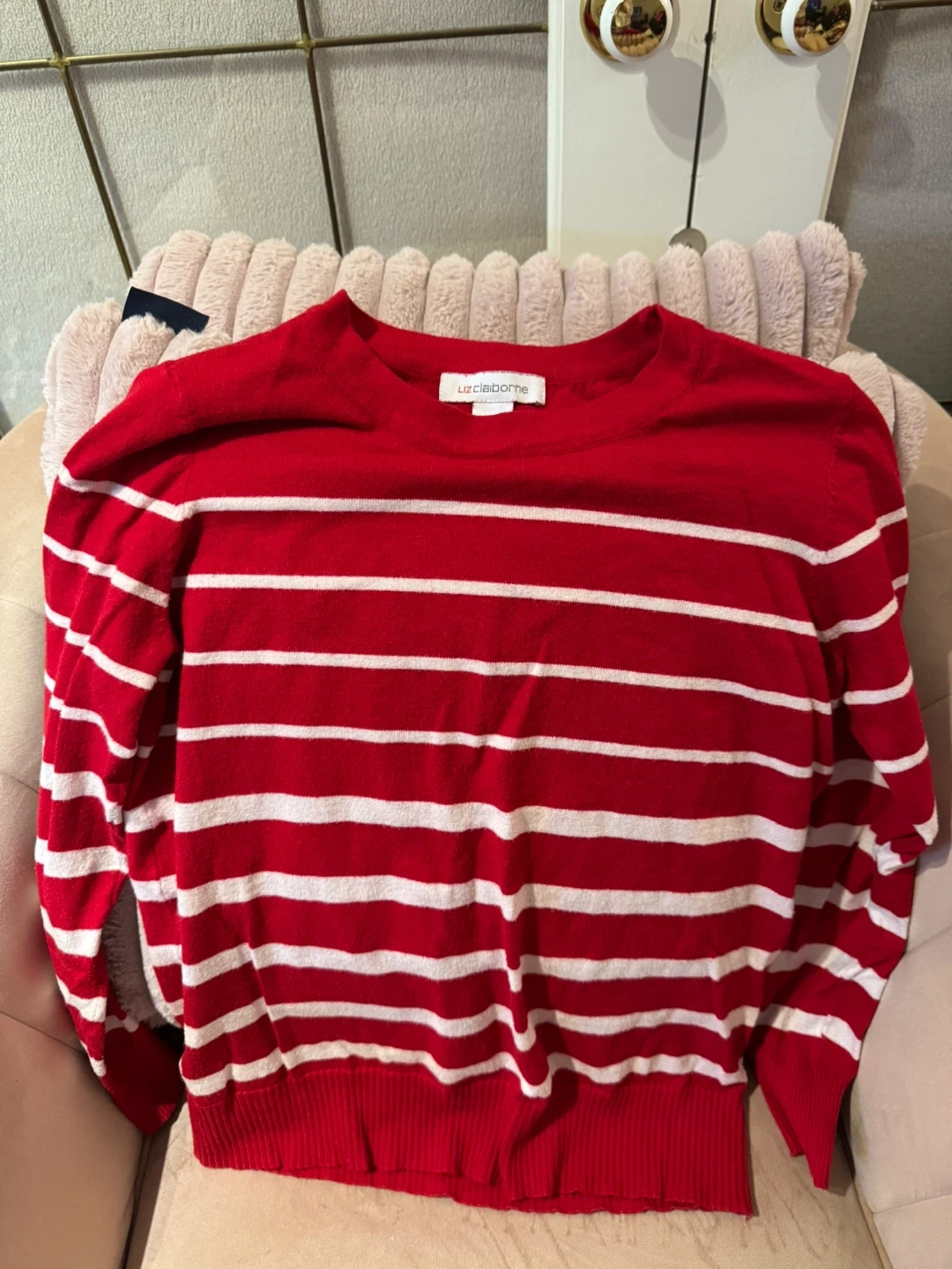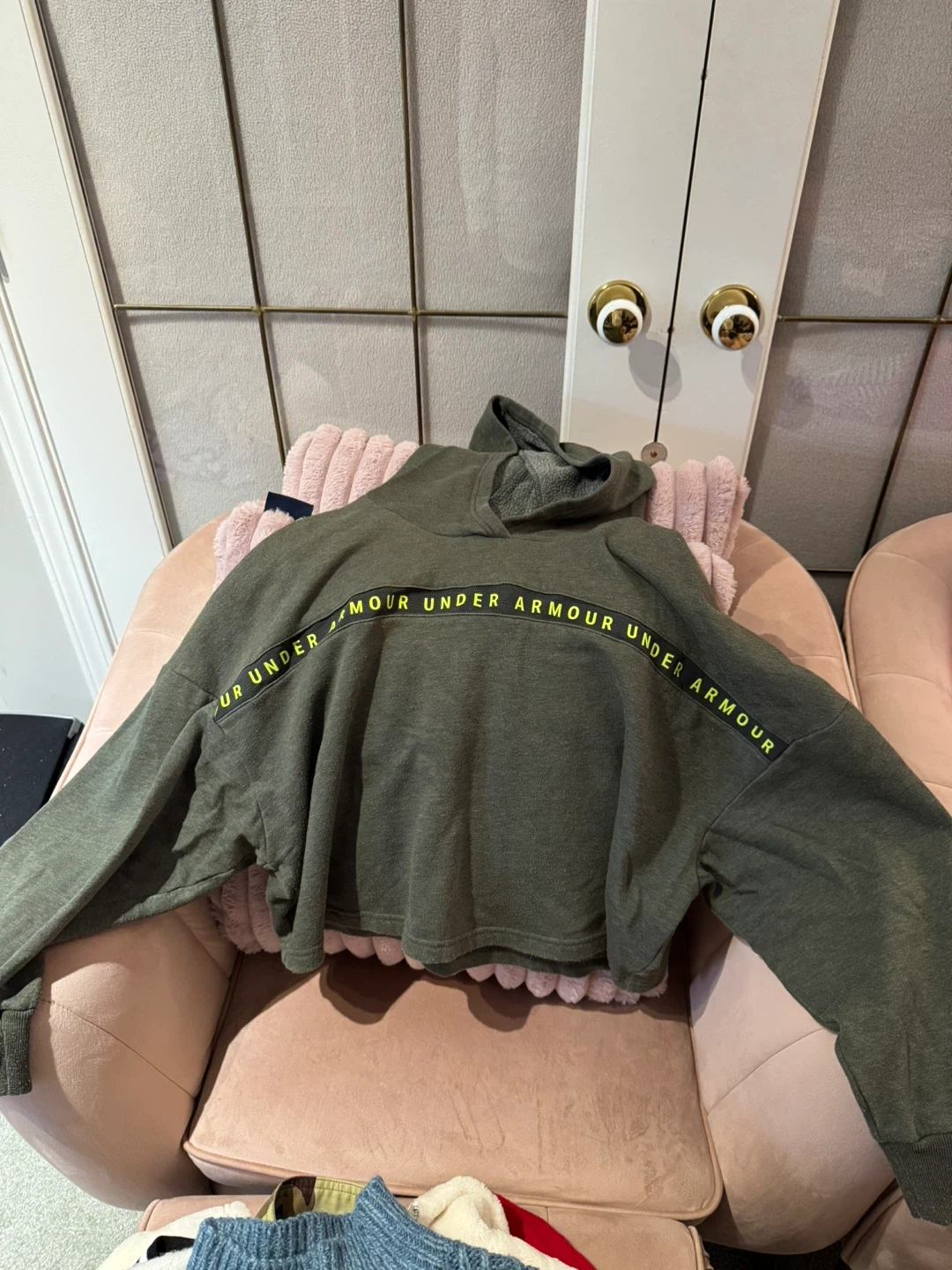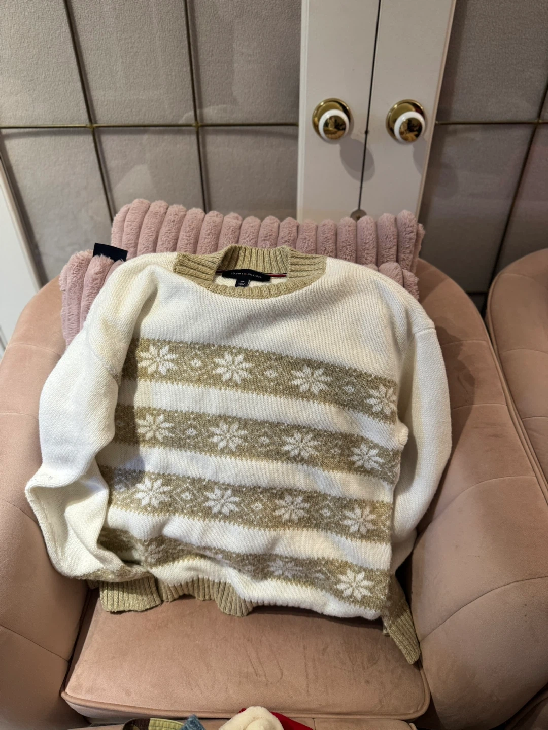A collection of sweaters and hoodies in good condition. Great for layering or staying cozy on cooler days! Includes a striped turtleneck, a snowflake pattern sweater, an Under Armour hoodie, and a navy sweater with '98' on the back