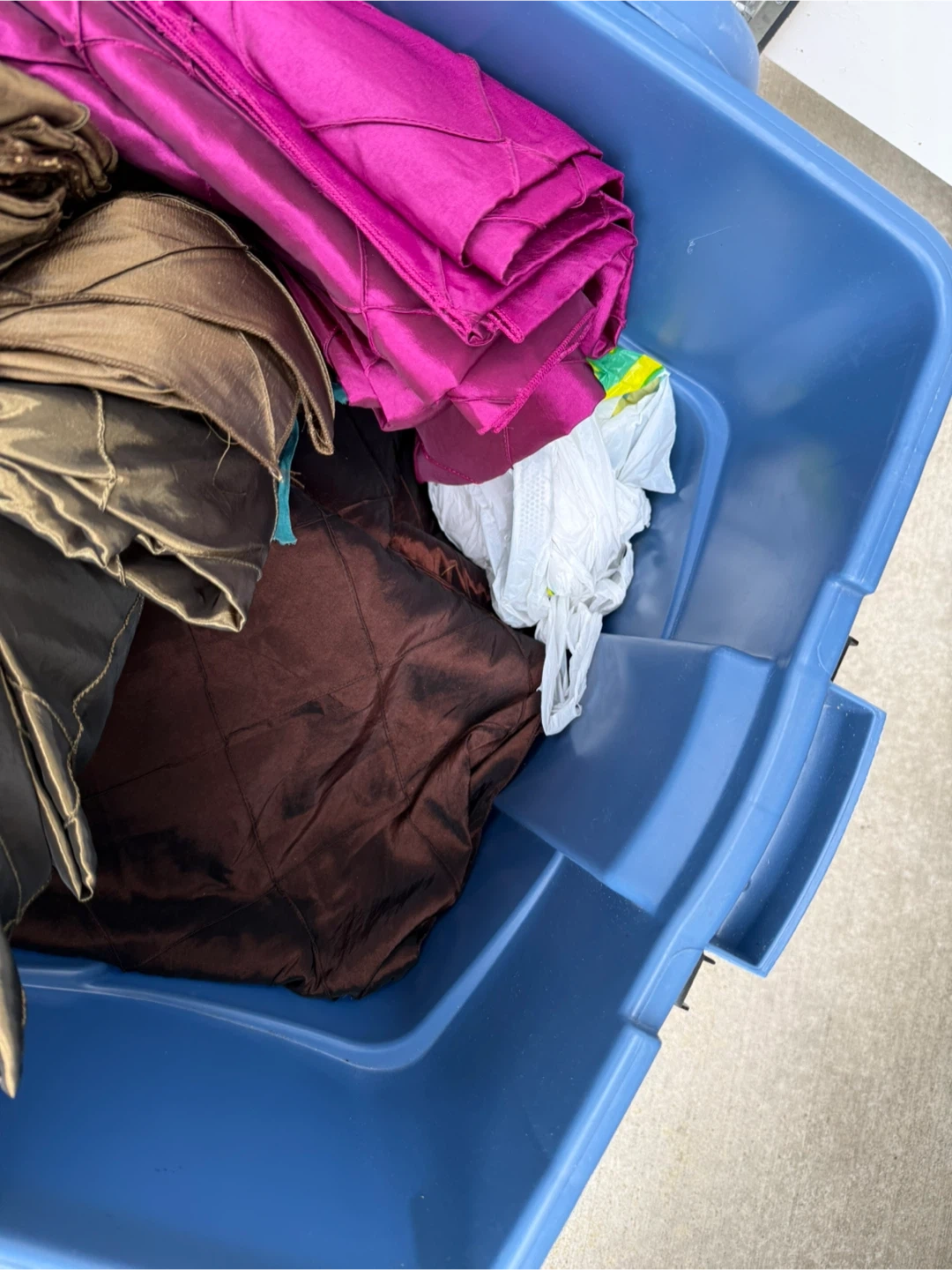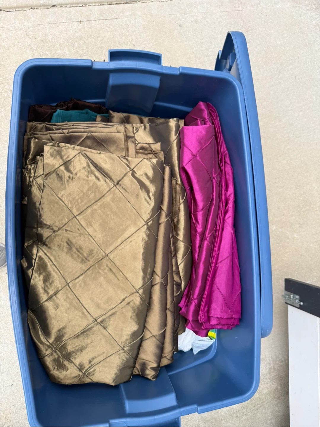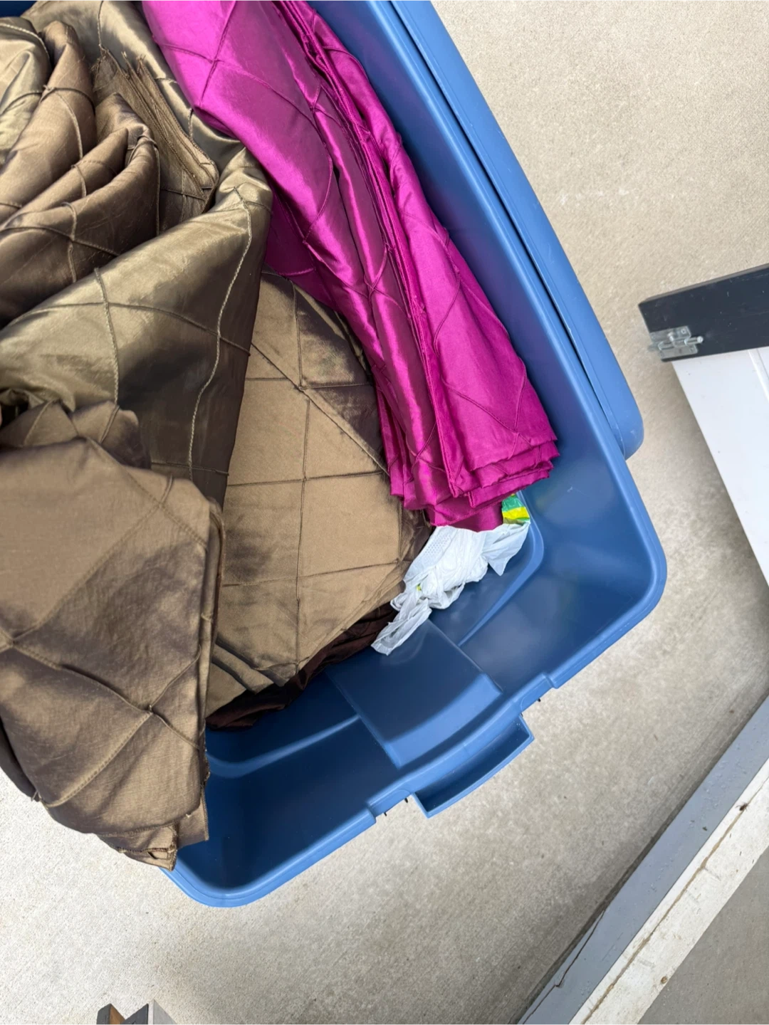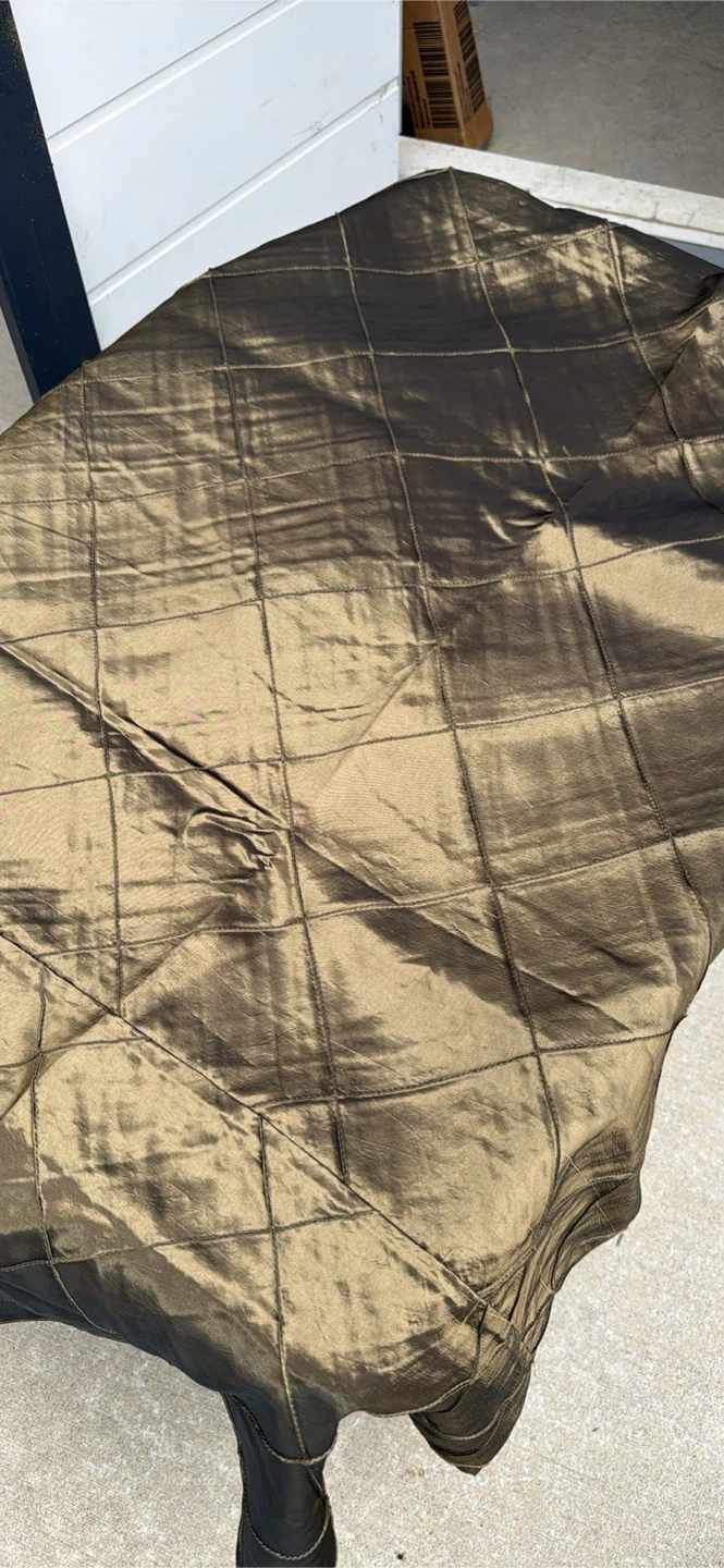 I have a collection of assorted tablecloths for sale! There are a few different colours and patterns, including brown and pink. They are made of a silky material with a quilted diamond pattern